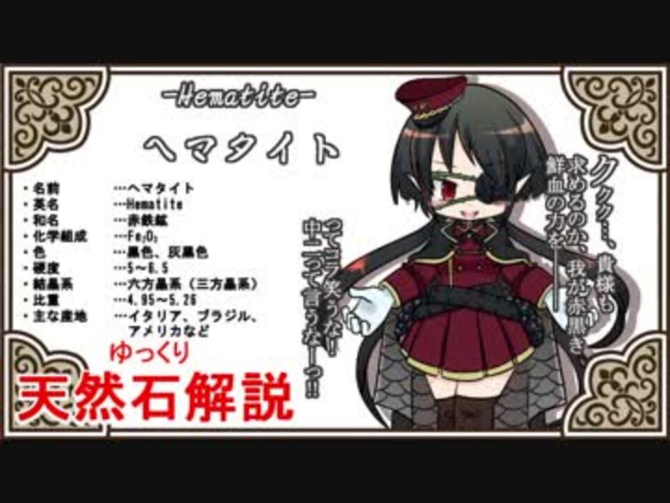 天然石・鉱物・パワーストーンをゆっくり解説していきます。<br><br>ご視聴、コメント、広告感謝感謝です。<br><br>リクエストありがとうございます!ヘマタイトです。<br>情報量が思いのほか多くて死んだ。<br><br>茶番飛ばし→<a href="#" class="seekTime" data-seekTime="1:18" onclick="seekNicoPlayer('#1:18'); return false;">#1:18</a> ~<br><br>擬人化の全身絵とちょっとした小ネタは静画参照→<a href="https://seiga.nicovideo.jp/seiga/im8561086" target="_blank" rel="noopener">im8561086</a><br><br>前→<a href="https://www.nicovideo.jp/watch/sm33897082" class="watch">sm33897082</a> (part 2 エンジェライト)<br><br>part 0→<a href="https://www.nicovideo.jp/watch/sm33864263" class="watch">sm33864263</a><br>ゆっくり天然石解説マイリス【<a href="https://www.nicovideo.jp/mylist/63380566" target="_blank" rel="noopener">mylist/63380566</a>】<br><br>次→<a href="https://www.nicovideo.jp/watch/sm33973088" class="watch">sm33973088</a> (part 4 サルファー)<br><br>.:*゚..:。:..:*゚..:。:. 【使用素材】.:*゚:.。:..:*゚:.。:.<br><br>背景画像…【creativefreaks】<br><a href="http://creativefreaks.net/?lang=ja/" target="_blank" rel="noopener nofollow">http://creativefreaks.net/?lang=ja/</a><br><br>BGM …【DOVA-SYNDROME】<br><a href="https://dova-s.jp/" target="_blank" rel="noopener nofollow">https://dova-s.jp/</a><br><br>.:*゚..:。:..:*゚..:。:. 【作者Twitter】.:*゚:.。:..:*゚:.。:.<br><br><a href="https://twitter.com/nerikeshi_pons" target="_blank" rel="noopener nofollow">https://twitter.com/nerikeshi_pons</a><br><br />「いいね」をすると本編シリーズでは「担当擬人化キャラの一言」みたいなお礼?メッセージが、<br>番外編などではきゆくろのつぶやきとかがあります。<br>これと言って誰も得しないシリーズですがうp主の黒歴史を覗き見するつもりでどうぞ。