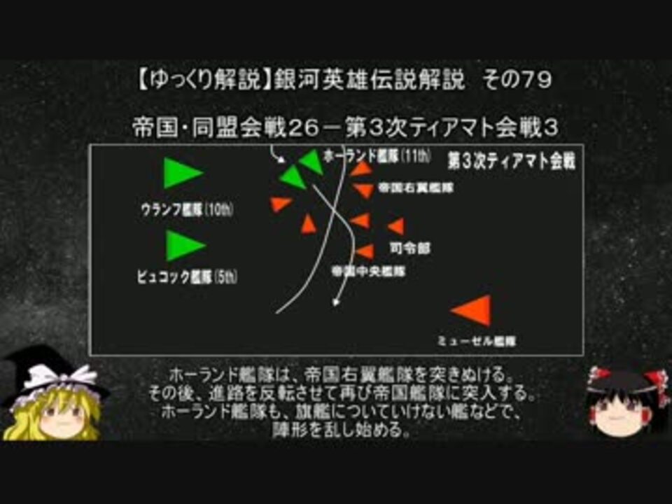 宇宙暦795年/帝国暦486年2月、帝国、同盟の両軍はティアマト星域で衝突する。<br />開戦当初は、両軍とも3艦隊を横並びして砲戦をする、平凡な形であった。<br />ただし、左翼のラインハルト艦隊は後方待機を命じられ、やや後方に配置されていた。<br />同盟軍の先任士官、ビュコック中将は消耗を出来るだけ避け、<br />参戦が予定されていた第4、第6艦隊の到着まで戦線を維持する方針であった。<br />開戦後しばらくして、ホーランド中将の第11艦隊は、猛然と突進して、<br />ラインハルト艦隊に挑んで行った。しかし、ラインハルト艦隊は後退して交戦を避けた。<br />第11艦隊は方向を転じて、帝国軍本隊(中央、右翼)に突入する。<br />帝国軍本隊に突入した第11艦隊は、帝国軍本隊の中を縦横無尽に動き回り、<br />第11艦隊は数倍の帝国軍本隊を相手に優勢に戦いを進めているように見えた。<br />同盟の第5、第10艦隊は、帝国軍本隊と第11艦隊が混然とした状況では、<br />味方を砲撃する事を懸念して援護する事が出来なかった。<br />ラインハルト艦隊も同様の状況であったが、ラインハルトは何か機が熟すのを待っていた。<br /><br />第01話 <a href="https://www.nicovideo.jp/watch/sm33175734" class="watch">sm33175734</a><br />第80話 <a href="https://www.nicovideo.jp/watch/sm33953660" class="watch">sm33953660</a><br />第78話 <a href="https://www.nicovideo.jp/watch/sm33927125" class="watch">sm33927125</a><br /><br />マイリスト <a href="https://www.nicovideo.jp/mylist/12818453" target="_blank" rel="noopener">mylist/12818453</a><br />コミュニティ co3805222<br /><br />