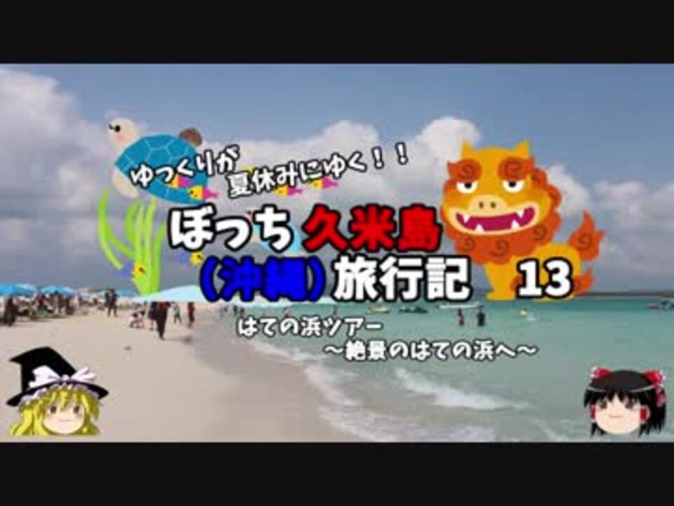<font color="#ff0000" size="4"><u>※Youtubeで1話分、先行配信中 </u></font><br /><font color="#0000ff" size="4"> <a href="http://www.youtube.com/c/なめこのぼっち旅" target="_blank" rel="noopener nofollow">http://www.youtube.com/c/なめこのぼっち旅</a></font> <br /><br /><b> </b>旅行3日目突入!<br />本日は丸々1日、はての浜で夏の海を満喫しますよ!<br />ぼっちでやけど・・・。<br /><br />第一話→<a href="https://www.nicovideo.jp/watch/sm33714205" class="watch">sm33714205</a><br /><br />1日目・・・伊丹→那覇編<br /> 2日目・・・久米島編<br /> 3日目・・・はての浜編<font color="#ff0000">←今ココ</font><br /> 4日目・・・帰路編<br /><br /><font color="#ff0000">コミュニティー→co2910020</font><br /> twitter→<a href="https://twitter.com/ryontan" target="_blank" rel="noopener nofollow">https://twitter.com/ryontan</a><br /><br /><a href="https://www.nicovideo.jp/watch/sm33921869" class="watch">sm33921869</a>←前回 <font color="#ff0000">次回 14話→<a href="https://www.nicovideo.jp/watch/sm33960367" class="watch">sm33960367</a></font><br /><br />解説・雑談系→<a href="https://www.nicovideo.jp/mylist/63171869" target="_blank" rel="noopener">mylist/63171869</a><br />今作 久米島(沖縄)旅行記→<a href="https://www.nicovideo.jp/mylist/63059251" target="_blank" rel="noopener">mylist/63059251</a><br />今作 車中泊旅行記→<a href="https://www.nicovideo.jp/mylist/54706524" target="_blank" rel="noopener">mylist/54706524</a><br /><b></b>前作 イギリスタイ旅行記→<a href="https://www.nicovideo.jp/mylist/60044833" target="_blank" rel="noopener">mylist/60044833</a><br />第6弾 クルーズ旅行記→<a href="https://www.nicovideo.jp/mylist/57397685" target="_blank" rel="noopener">mylist/57397685</a><br />第5弾 ドイツ周遊記→<a href="https://www.nicovideo.jp/mylist/54938346" target="_blank" rel="noopener">mylist/54938346</a><br />第4弾 北海道旅行記→<a href="https://www.nicovideo.jp/mylist/52618057" target="_blank" rel="noopener">mylist/52618057</a><br />第3弾 アメリカ横断記→<a href="https://www.nicovideo.jp/mylist/48621785" target="_blank" rel="noopener">mylist/48621785</a><br />第2弾 イタリア周遊記→<a href="https://www.nicovideo.jp/mylist/45763559" target="_blank" rel="noopener">mylist/45763559</a><br />第1弾 NY旅行記→<a href="https://www.nicovideo.jp/mylist/44343854" target="_blank" rel="noopener">mylist/44343854</a><font color="#ff0000" size="5"><font color="#000000" size="2"><br /></font></font>