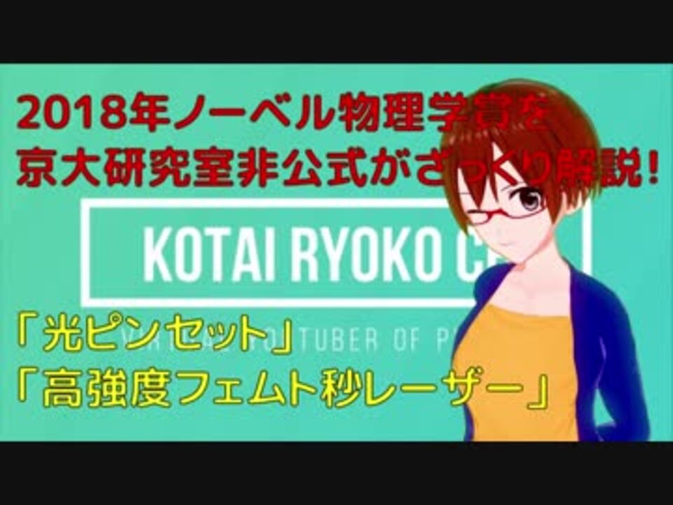 2018年もノーベル物理学賞が発表されました! 今年、ノーベル物理学賞を受賞したのはアーサー・アシュキンさん、ジェラール・モーローさん、ドーナ・ストリックランドさんの三人でした。 <br>今年のノーベル物理学賞の内容を解説します! <br>動画中のほとんどの画像はノーベル財団のTwitter:@NovelPrizeからお借りしています。 <br>ノーベル財団による詳しい解説:<a href="https://twitter.com/NobelPrize/status/1047086052417134593" target="_blank" rel="noopener nofollow">https://twitter.com/NobelPrize/status/1047086052417134593</a><font color="#14171a">Twitter:</font><a href="https://twitter.com/qm_phys_kyoto" target="_blank" rel="noopener nofollow">https://twitter.com/qm_phys_kyoto</a> <br><font color="#14171a">Youtubeチャンネル:</font><a href="https://www.youtube.com/channel/UC29mFGKxSkn0lrj03_xyrHg" target="_blank" rel="noopener nofollow">https://www.youtube.com/channel/UC29mFGKxSkn0lrj03_xyrHg</a> … <br><font color="#111111">次(セルフ論文解説)</font><font color="#111111">:</font><a href="https://www.nicovideo.jp/watch/sm33973842" class="watch">sm33973842</a><font color="#111111"><br>前(</font><font color="#001835">NMR入門その1</font>)<font color="#111111">:</font><a href="https://www.nicovideo.jp/watch/sm33941439" class="watch">sm33941439</a><font color="#111111"><br>固体量子チャンネル(非公式):</font><a href="https://www.nicovideo.jp/mylist/63258839" target="_blank" rel="noopener">mylist/63258839</a><font color="#111111"><br></font><font color="#111111">使用ソフト: Vカツ voiceroid2 琴葉</font>茜<font color="#111111"> filmora、使用音楽:</font>散歩日和<font color="#111111"> by </font>hotaru sounds <font color="#111111">様(BGM) Let’s Study! by ヒの字様(ジングル) 、使用フォント: Rounded Mgen+</font>