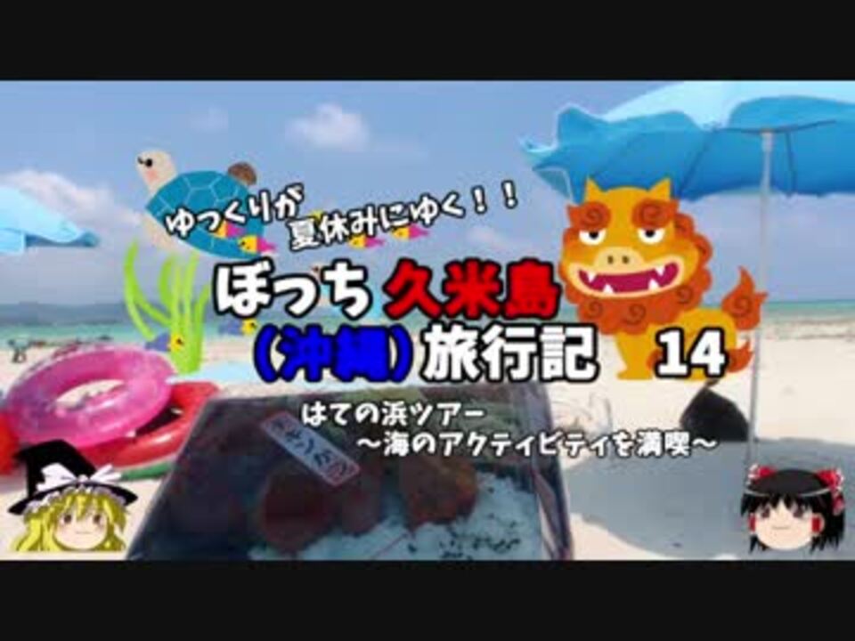 <font color="#ff0000" size="4"><u>※Youtubeで1話分、先行配信中 </u></font><br /><font color="#0000ff" size="4"> <a href="http://www.youtube.com/c/なめこのぼっち旅" target="_blank" rel="noopener nofollow">http://www.youtube.com/c/なめこのぼっち旅</a></font> <br /><br /><b> </b>今回は海のアクティビティー満載!<br />ウミガメ見に行ったり、ジェットスキー(の後ろ)に乗ったり、<br />魚見たり、弁当食べたり!<br /><br />第一話→<a href="https://www.nicovideo.jp/watch/sm33714205" class="watch">sm33714205</a><br /><br />1日目・・・伊丹→那覇編<br /> 2日目・・・久米島編<br /> 3日目・・・はての浜編<font color="#ff0000">←今ココ</font><br /> 4日目・・・帰路編<br /><br /><font color="#ff0000">コミュニティー→co2910020</font><br /> twitter→<a href="https://twitter.com/ryontan" target="_blank" rel="noopener nofollow">https://twitter.com/ryontan</a><br /><br /><a href="https://www.nicovideo.jp/watch/sm33941119" class="watch">sm33941119</a>←前回 <font color="#ff0000">次回 15話→<a href="https://www.nicovideo.jp/watch/sm33979785" class="watch">sm33979785</a></font><br /><br />解説・雑談系→<a href="https://www.nicovideo.jp/mylist/63171869" target="_blank" rel="noopener">mylist/63171869</a><br />今作 久米島(沖縄)旅行記→<a href="https://www.nicovideo.jp/mylist/63059251" target="_blank" rel="noopener">mylist/63059251</a><br />今作 車中泊旅行記→<a href="https://www.nicovideo.jp/mylist/54706524" target="_blank" rel="noopener">mylist/54706524</a><br /><b></b>前作 イギリスタイ旅行記→<a href="https://www.nicovideo.jp/mylist/60044833" target="_blank" rel="noopener">mylist/60044833</a><br />第6弾 クルーズ旅行記→<a href="https://www.nicovideo.jp/mylist/57397685" target="_blank" rel="noopener">mylist/57397685</a><br />第5弾 ドイツ周遊記→<a href="https://www.nicovideo.jp/mylist/54938346" target="_blank" rel="noopener">mylist/54938346</a><br />第4弾 北海道旅行記→<a href="https://www.nicovideo.jp/mylist/52618057" target="_blank" rel="noopener">mylist/52618057</a><br />第3弾 アメリカ横断記→<a href="https://www.nicovideo.jp/mylist/48621785" target="_blank" rel="noopener">mylist/48621785</a><br />第2弾 イタリア周遊記→<a href="https://www.nicovideo.jp/mylist/45763559" target="_blank" rel="noopener">mylist/45763559</a><br />第1弾 NY旅行記→<a href="https://www.nicovideo.jp/mylist/44343854" target="_blank" rel="noopener">mylist/44343854</a><font color="#ff0000" size="5"><font color="#000000" size="2"><br /></font></font>