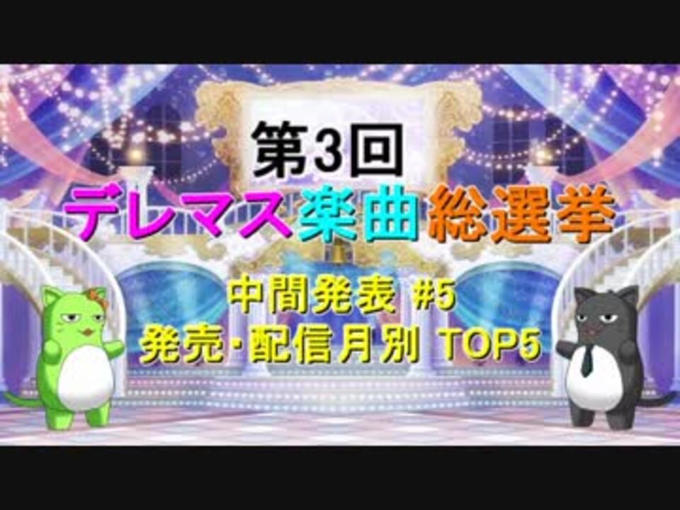 <b><font color="#980000">2018/9/3の12時</font></b>までに音源の存在するデレマス楽曲(カバー曲込、<b><font color="#0000ff">計269曲</font></b>)に対する人気投票<br>企画の中間発表5回目です。参加者<b><font color="#7700ff">1500名</font></b>の結果から、全楽曲を<font color="#ff7700"><b>Full ver.が発売・配信された月</b></font><br>で分類し、<b><font color="#00ff00">各月のTOP3(1月のみTOP3)</font></b>をご紹介します。<br><br><font size="3"><font color="#ff0000"><b>※楽曲情報は最初期の物を使用(音源・画像と不一致の場合あり)。 <br>※「Kawaii make MY day!」~「クレイジークレイジー」は先行配信日の8月に分類</b></font></font><br><br> ★告知 & 楽曲紹介:<a href="https://www.nicovideo.jp/watch/sm33796421" class="watch">sm33796421</a><br> ★投票対象一覧:<a href="https://ch.nicovideo.jp/article/ar1659816" target="_blank" rel="noopener">ar1659816</a><br><br><font size="4"><b>最終結果投稿しました!→総合:</b></font><font size="4"><a href="https://www.nicovideo.jp/watch/sm34234847" class="watch">sm34234847</a></font><font size="4"><b> / P属性:</b></font><font size="4"><a href="https://www.nicovideo.jp/watch/sm34234900" class="watch">sm34234900</a></font> <br><br>○中間4回目:<a href="https://www.nicovideo.jp/watch/sm33932433" class="watch">sm33932433</a><br>○中間6回目:<a href="https://www.nicovideo.jp/watch/sm34006920" class="watch">sm34006920</a><br> ●デレマス 楽曲総選挙:<a href="https://www.nicovideo.jp/mylist/56869647" target="_blank" rel="noopener">mylist/56869647</a>