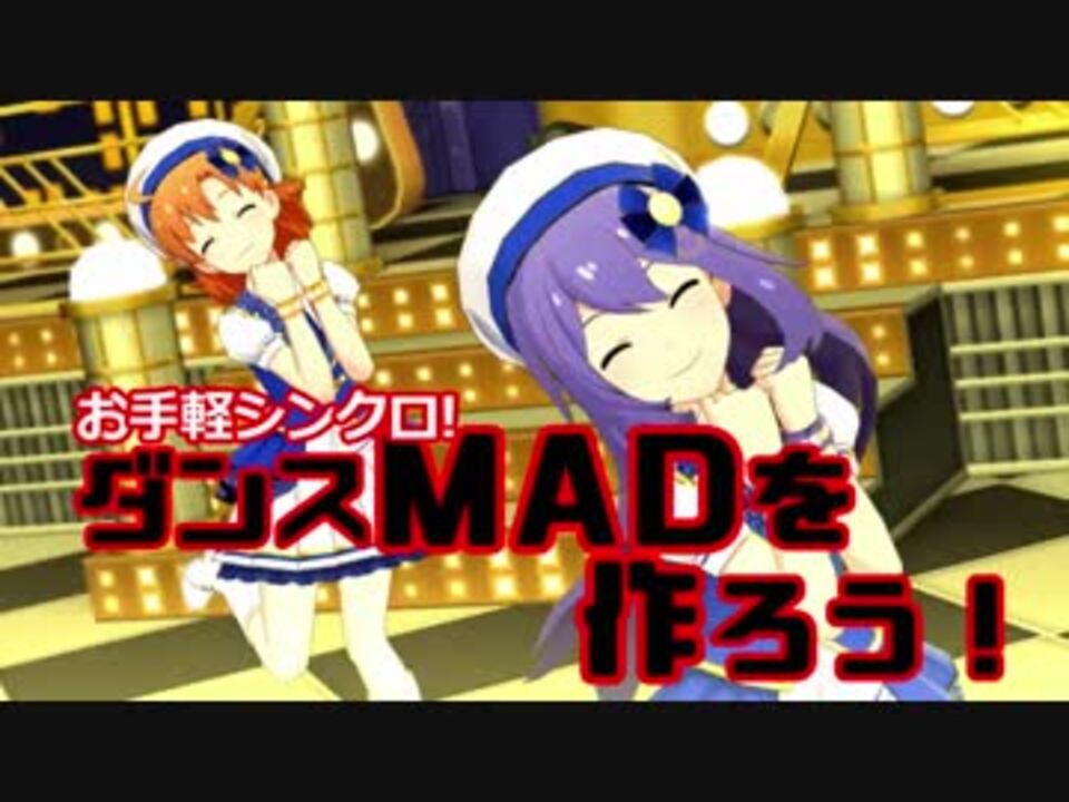 <span style="color: #ff9900; font-size: 16px;">好きな曲にダンスシンクロさせるのって、すっごい楽しいんですよ!</span><br><br>センスがなくても。<br>一生懸命ダンスを選ばなくても。<br>お気楽に。<br>誰にでもできる。<br><br>そんなやり方を紹介します。<br><br><span style="color: #ff0000;">ぜひいっしょに遊びましょう!</span><br><br><br>このやり方でどんな動画が作れるかは、俺の過去作を見てくださいねー。<br><br><span style="color: #ff9900;">2018/10/06追記</span><br>動画制作に至る経緯とか、呟いていただいた感想とか、関連したやりとりとか、トゥギャってます【随時更新】<br><span style="color: #ff0000; font-size: 16px;">Togetterの「編集部が選んだイチオシまとめ」としても取り上げてもらいました! </span><br><a href="https://togetter.com/li/1273659" target="_blank" rel="noopener nofollow">https://togetter.com/li/1273659</a><br><br><span style="color: #ff0000;">■ダンスMADを作ろうシリーズ</span><br>キャプチャ <a href="https://www.nicovideo.jp/watch/sm33987499" class="watch">sm33987499</a><br>衣装差分による変身 <a href="https://www.nicovideo.jp/watch/sm35080806" class="watch">sm35080806</a><br /><span style="color: #ff0000;">■最新作</span><br><a href="https://www.nicovideo.jp/watch/sm42609884" class="watch">sm42609884</a> 【人力VOCALOID】Tinkling Smile【箱崎星梨花】3Dリッチ<br><span style="color: #0000ff;">■おすすめ過去作 </span><br><a href="https://www.nicovideo.jp/watch/sm41130394" class="watch">sm41130394</a> 紬×静香でリコリコOP「ALIVE」<br><a href="https://www.nicovideo.jp/watch/sm39318633" class="watch">sm39318633</a> ザコメンタルのビターステップ<br><a href="https://www.nicovideo.jp/watch/sm39146131" class="watch">sm39146131</a> ゆかさえで『淋しい熱帯魚』<br><a href="https://www.nicovideo.jp/watch/sm38801418" class="watch">sm38801418</a> つむかれニーハイ!Poppin' Shakin'!【と、つむつむ七変化】<br><a href="https://www.nicovideo.jp/watch/sm37259368" class="watch">sm37259368</a> スカイクラッドの観測者 二宮飛鳥カバーFull【3Dリッチ】<br><a href="https://www.nicovideo.jp/watch/sm36437062" class="watch">sm36437062</a> 有償石には手を出すな!<br><a href="https://www.nicovideo.jp/watch/sm36050395" class="watch">sm36050395</a> 【エムステ/デレステ/ミリシタ】アイドル108人で KOME KOME WAR!ばい!!<br><a href="https://www.nicovideo.jp/watch/sm35937063" class="watch">sm35937063</a> 7thメンバーでEzDoDance【デレ+TRF音源】<br><a href="https://www.nicovideo.jp/watch/sm35369200" class="watch">sm35369200</a><span style="color: #000000; font-size: 13px;"> </span>【ビシバシいくでありますよ!】お願いマッスル【デレステMAD】<br><a href="https://www.nicovideo.jp/watch/sm34829359" class="watch">sm34829359</a> 【765×346高校学園祭】Don't say "lazy"<br><a href="https://www.nicovideo.jp/watch/sm34078748" class="watch">sm34078748</a> 名探偵ナンナン 運命のルーレット廻して<br><a href="https://www.nicovideo.jp/watch/sm33970606" class="watch">sm33970606</a> お気楽シンクロ!ダンスMADを作ろう [AviUtl]<br><a href="https://www.nicovideo.jp/watch/sm33894794" class="watch">sm33894794</a> 【ゆるキャン△】SHINY DAYS【ミリシタ&デレステMAD】<br><a href="https://www.nicovideo.jp/watch/sm33274046" class="watch">sm33274046</a> 【矢島美容室】ニホンノミカタ-ネバダカラキマシタ-【feat白石紬】<br><a href="https://www.nicovideo.jp/watch/sm32759703" class="watch">sm32759703</a> 【アイドル投票TB結果発表】39人の「ライオン」【おかえり琴葉】<br><span style="color: #ff00ff;">■参加作品等も含むマイリスト</span><br><a href="https://www.nicovideo.jp/mylist/26053214" target="_blank" rel="noopener nofollow">https://www.nicovideo.jp/mylist/26053214</a>