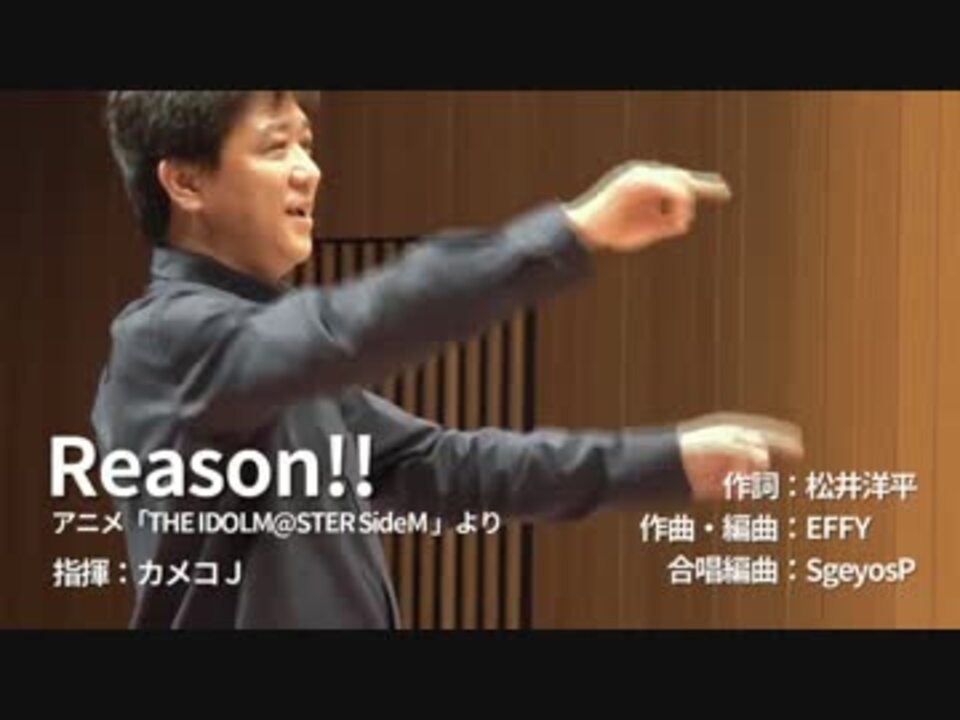 <b><font color="#ff0000" size="4">アニメ「アイドルマスターsideM」放送開始1周年記念!!</font></b><br /><br />2018年8月19日(日)に開催されました、<br />第四回副次的文化系合唱祭~声宴~でのアイマス合唱部@関東のステージをお送りします。<br /><br />「Reason!!」(アニメ「アイドルマスターsideM」OP曲)<br />作詞:松井洋平<br />作曲・編曲:EFFY<br />合唱編曲:SgesosP<br />指揮:カメコJ<br /><br />2曲目→「PANDEMIC ALONE」<a href="https://www.nicovideo.jp/watch/sm34020666" class="watch">sm34020666</a><br />3曲目→「in fact」<a href="https://www.nicovideo.jp/watch/sm34020915" class="watch">sm34020915</a><br /><br />ツイッター:@関東(@imas_choir)<br /> @関西(@imas_choir_west)<br /> @中部(@imas_choir_midd)<br /> @北陸(@imas_choir_hoku)<br /><br />その他動画:<a href="https://www.nicovideo.jp/mylist/55899387" target="_blank" rel="noopener">mylist/55899387</a>