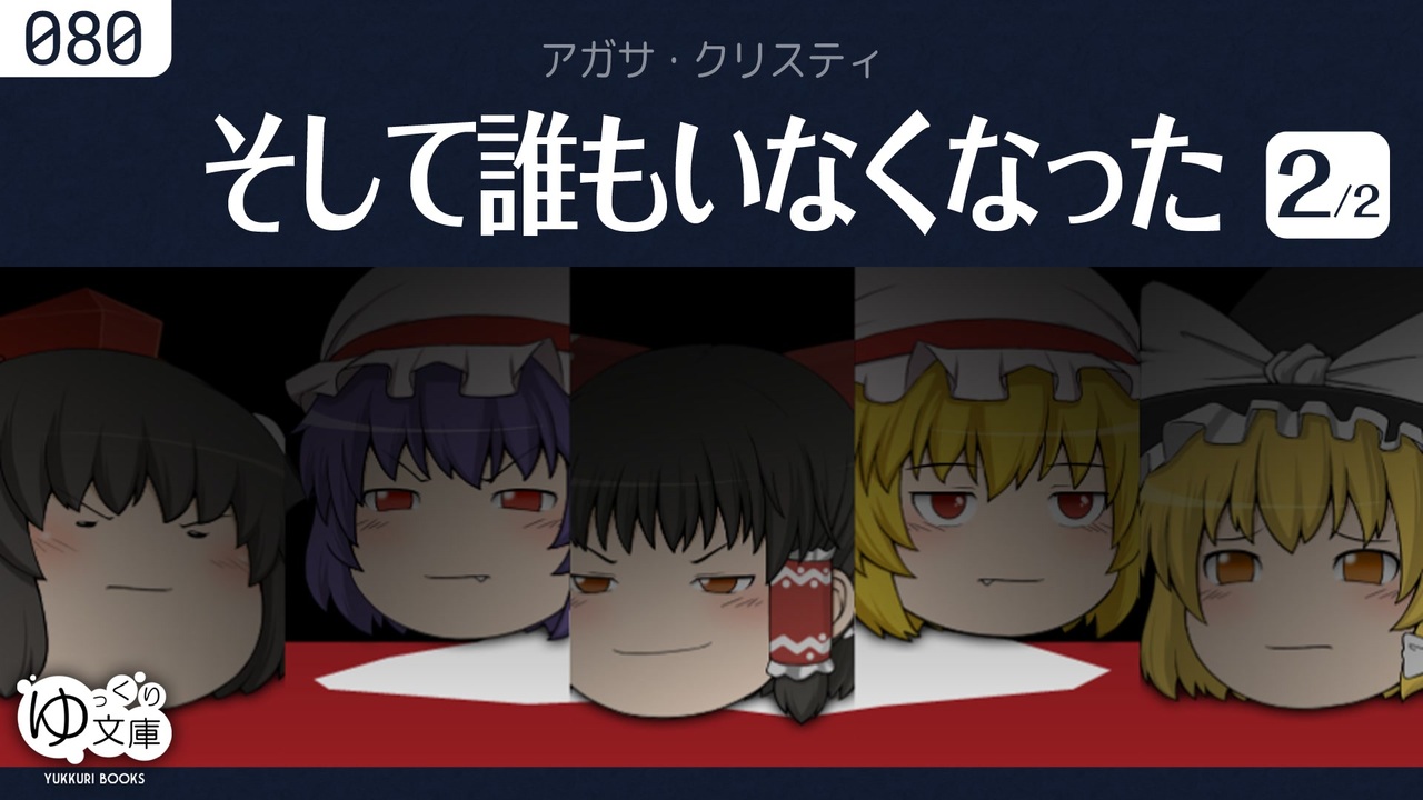 <span style="color: red;"><strong>080b 外へ出よう──</strong></span><br>残るは5名。互いを恐れる気持ちが、オーエンの暗躍を許してしまう。後手にまわる客たち。生きて島から脱出できるか?<br><span style="color: green;">And Then There Were None by Agatha Christie (1939)</span><br>編集後記:<a href="http://trynext.com/story/ybook/yb080.php" target="_blank" rel="noopener nofollow">http://trynext.com/story/ybook/yb080.php</a><br><br>●ゆっクリスティ <a href="https://www.nicovideo.jp/mylist/59497715" target="_blank" rel="noopener">mylist/59497715</a><br>◆ミス・マープル<br><a href="https://www.nicovideo.jp/watch/sm24238713" class="watch">sm24238713</a> 完璧なメイド<br><a href="https://www.nicovideo.jp/watch/sm25512772" class="watch">sm25512772</a> 動機と機会<br><a href="https://www.nicovideo.jp/watch/sm26942176" class="watch">sm26942176</a> 青いゼラニウム<br><a href="https://www.nicovideo.jp/watch/sm30507320" class="watch">sm30507320</a> ポケットにライ麦を (全3話)<br><a href="https://www.nicovideo.jp/watch/sm32946182" class="watch">sm32946182</a> パディントン発4時50分(On Going)<br><a href="https://www.nicovideo.jp/watch/sm38609548" class="watch">sm38609548</a> # 原作に近い版<br><a href="https://www.nicovideo.jp/watch/sm33091342" class="watch">sm33091342</a> 鏡は横にひび割れて<br><a href="https://www.nicovideo.jp/watch/sm37048244" class="watch">sm37048244</a> 予告殺人 #1 殺人のお知らせ<br><a href="https://www.nicovideo.jp/watch/sm37064125" class="watch">sm37064125</a> #2 ゲドラーの遺産<br><a href="https://www.nicovideo.jp/watch/sm37075231" class="watch">sm37075231</a> #3 甘美なる死<br><a href="https://www.nicovideo.jp/watch/sm37088256" class="watch">sm37088256</a> #4 やさしい殺人者<br><a href="https://www.nicovideo.jp/watch/sm37202036" class="watch">sm37202036</a> #z ドラ・バンナーは間違っていたか?<br><br>◆ポワロ<br><a href="https://www.nicovideo.jp/watch/sm25458371" class="watch">sm25458371</a> スズメバチの巣<br><a href="https://www.nicovideo.jp/watch/sm38918082" class="watch">sm38918082</a> オリエント急行の殺人(On Going)<br><a href="https://www.nicovideo.jp/watch/sm39365170" class="watch">sm39365170</a> ナイルに死す (全3話)<br><a href="https://www.nicovideo.jp/watch/sm40164143" class="watch">sm40164143</a> 消えた遺言書<br><br>◆ほか<br><a href="https://www.nicovideo.jp/watch/sm33975066" class="watch">sm33975066</a> そして誰もいなくなった (全2話)<br><a href="https://www.nicovideo.jp/watch/sm33981315" class="watch">sm33981315</a> <span style="color: #ff00ff;"><strong>#2</strong></span><br><a href="https://www.nicovideo.jp/watch/sm33986818" class="watch">sm33986818</a> #pv 松谷祐子「愛はブーメラン」<br><br>●ゆっくり文庫について<br>全部:<a href="https://www.nicovideo.jp/mylist/74874627" target="_blank" rel="noopener">mylist/74874627</a><br>近況:<a href="https://twitter.com/trynext" target="_blank" rel="noopener nofollow">https://twitter.com/trynext</a><br><br>(訂正)<br><a href="#" class="seekTime" data-seekTime="06:21" onclick="seekNicoPlayer('#06:21'); return false;">#06:21</a> ベラ → ヴェラ<br><br>●そして誰もいなくなった<br><a href="#" class="seekTime" data-seekTime="01:00" onclick="seekNicoPlayer('#01:00'); return false;">#01:00</a> 裁判所に入って4人<br><a href="#" class="seekTime" data-seekTime="09:16" onclick="seekNicoPlayer('#09:16'); return false;">#09:16</a> 燻製ニシンにのまれて3人<br><a href="#" class="seekTime" data-seekTime="16:06" onclick="seekNicoPlayer('#16:06'); return false;">#16:06</a> クマに襲われて2人<br><a href="#" class="seekTime" data-seekTime="14:49" onclick="seekNicoPlayer('#14:49'); return false;">#14:49</a> 日干しになって1人<br><a href="#" class="seekTime" data-seekTime="15:50" onclick="seekNicoPlayer('#15:50'); return false;">#15:50</a> 首をくくって0人<br>