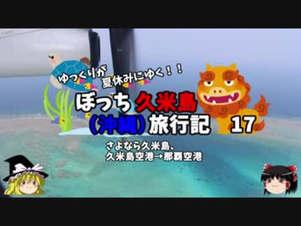 <font color="#ff0000" size="4"><u>※Youtubeで1話分、先行配信中 </u></font><br /><font color="#0000ff" size="4"> <a href="http://www.youtube.com/c/なめこのぼっち旅" target="_blank" rel="noopener nofollow">http://www.youtube.com/c/なめこのぼっち旅</a></font> <br /><br /><b> </b>今回は久米島空港→那覇空港へ移動します。<br />海が綺麗なんじゃ~!!<br /><br />第一話→<a href="https://www.nicovideo.jp/watch/sm33714205" class="watch">sm33714205</a><br /><br />1日目・・・伊丹→那覇編<br /> 2日目・・・久米島編<br /> 3日目・・・はての浜編<br /> 4日目・・・帰路編<font color="#ff0000">←今ココ</font><br /><br /><font color="#ff0000">コミュニティー→co2910020</font><br /> twitter→<a href="https://twitter.com/ryontan" target="_blank" rel="noopener nofollow">https://twitter.com/ryontan</a><br /><br /><a href="https://www.nicovideo.jp/watch/sm33998044" class="watch">sm33998044</a>←前回 <font color="#ff0000">次回 18話→<a href="https://www.nicovideo.jp/watch/sm34033907" class="watch">sm34033907</a></font><br /><br />解説・雑談系→<a href="https://www.nicovideo.jp/mylist/63171869" target="_blank" rel="noopener">mylist/63171869</a><br />今作 久米島(沖縄)旅行記→<a href="https://www.nicovideo.jp/mylist/63059251" target="_blank" rel="noopener">mylist/63059251</a><br />今作 車中泊旅行記→<a href="https://www.nicovideo.jp/mylist/54706524" target="_blank" rel="noopener">mylist/54706524</a><br /><b></b>前作 イギリスタイ旅行記→<a href="https://www.nicovideo.jp/mylist/60044833" target="_blank" rel="noopener">mylist/60044833</a><br />第6弾 クルーズ旅行記→<a href="https://www.nicovideo.jp/mylist/57397685" target="_blank" rel="noopener">mylist/57397685</a><br />第5弾 ドイツ周遊記→<a href="https://www.nicovideo.jp/mylist/54938346" target="_blank" rel="noopener">mylist/54938346</a><br />第4弾 北海道旅行記→<a href="https://www.nicovideo.jp/mylist/52618057" target="_blank" rel="noopener">mylist/52618057</a><br />第3弾 アメリカ横断記→<a href="https://www.nicovideo.jp/mylist/48621785" target="_blank" rel="noopener">mylist/48621785</a><br />第2弾 イタリア周遊記→<a href="https://www.nicovideo.jp/mylist/45763559" target="_blank" rel="noopener">mylist/45763559</a><br />第1弾 NY旅行記→<a href="https://www.nicovideo.jp/mylist/44343854" target="_blank" rel="noopener">mylist/44343854</a><font color="#ff0000" size="5"><font color="#000000" size="2"><br /></font></font>