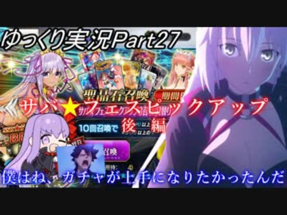 皆様、おはこんばんちわ!<br>(*'ω'*) いつもご視聴ありがとうございます! <br><br>サバ☆フェス後編です!<br>果たして<font color="#262626"><b><u>水着鯖(女性)</u></b></font>コンプリート達成になるか否か…<br>動画にカクつきが見られ場合がありますのでご了承ください。 <font color="#14171a"><br>(ㅅ´ ˘ `)</font>最後までお付き合い頂ければ幸いです。<br><br>すっかり季節も変わり 、 ギル祭そしてハロウィン復刻!<br>ギル祭は、目標通り200箱達成しましたが、素材は尽きました…_(:3」∠)_<br><br>次回⇒<a href="https://www.nicovideo.jp/watch/sm34170680" class="watch">sm34170680</a><br>前回⇒<a href="https://www.nicovideo.jp/watch/sm33766958" class="watch">sm33766958</a><br><br>マイリスト⇒<a href="https://www.nicovideo.jp/mylist/59483807" target="_blank" rel="noopener">mylist/59483807</a><br>Twitterアカウント⇒twitter.com/BECK_yukkuriFGO<br>ガチャの生放送配信は、twitterで報告しております。 <br>皆様のフォローお待ちしております! <br>