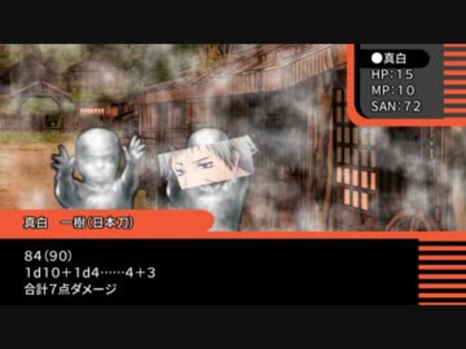 本作は、「 株式会社アークライト 」及び「株式会社KADOKAWA」が権利を有する『クトゥルフ神話TRPG』の二次創作物です。<br><br>Call of Cthulhu is copyright ©1981, 2015, 2019 by Chaosium Inc. ;all rights reserved. Arranged by Arclight Inc.<br>Call of Cthulhu is a registered trademark of Chaosium Inc.<br>PUBLISHED BY KADOKAWA CORPORATION 「クトゥルフ神話TRPG」<br><br><span style="font-size: 18px;">今回色々と酷いです。</span><br>内容よりも、絵面(画面)が。<br>キャライメージを損ねたくない方は、回れ右を推奨します。<br>前編よりもさらにシュールになってしまいました……。<br><br>身内卓を動画化しています。<br>ハウスルールましましで色々緩いですが、ご容赦ください。<br><br>また、継続探索者が登場します。<br>先に過去作品を見ていただいた方が、楽しんでいただけると思います。<br>過去作のネタバレも含みますので、何卒ご了承ください。<br>(関連作品:黒薔薇館の怪、共食、土に溺れる、赤の遺言、鬼猫犯科帳、白の囚人、青に染まる夜、探検は危険がいっぱい、軋む籠、ネオンのくすむ街 、閉じられた夢、陽の微笑み、影の嘆き、黒の共演+大正編) <br><span style="font-size: 10px;">多くてすみません。</span><br><br>広告して下さる皆さん、いつもありがとうございます。<br>まとめてのお礼となりまして恐縮ですが、今後とも頑張ります。<br><br>[クトゥルフ動画一覧]<a href="https://www.nicovideo.jp/mylist/60110794" target="_blank" rel="noopener">mylist/60110794</a><br>[part1動画一覧]<a href="https://www.nicovideo.jp/mylist/60289921" target="_blank" rel="noopener">mylist/60289921</a><br>[短編・単発mylist]<a href="https://www.nicovideo.jp/mylist/60598854" target="_blank" rel="noopener">mylist/60598854</a><br><br>[前]<a href="https://www.nicovideo.jp/watch/sm34057239" class="watch">sm34057239</a><br>[次]<a href="https://www.nicovideo.jp/watch/sm34062830" class="watch">sm34062830</a><br /><br>色猫卓ポータルサイト<br>→<a href="https://marchocias.xsrv.jp/colorcat/index.html" target="_blank" rel="noopener nofollow">https://marchocias.xsrv.jp/colorcat/index.html</a><br>動画で紹介しても良い支援絵は #いろねこあーと で!<br><br>ピッコマで小説連載開始しました!<br>魔族生まれの聖女様!? 著:黒猫ている<br><a href="https://piccoma.com/web/product/156938" target="_blank" rel="noopener nofollow">https://piccoma.com/web/product/156938</a>