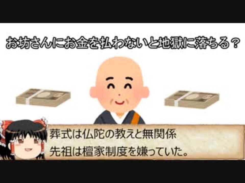 別にお坊さんにお金を払わなくてもいいんだよといいたいだけの動画。<br>少しいいすぎの感があるので熱心な大乗仏教徒は見ないでね。<br>投稿者は論理と知性を愛する空を飛ぶスパゲッティ・モンスター教徒です。<br><br>日本の仏教はブッダの教えではない!? <a href="https://www.nicovideo.jp/watch/sm33989598" class="watch">sm33989598</a><br>大安・仏滅の六曜占い解説 <a href="https://www.nicovideo.jp/watch/sm34017111" class="watch">sm34017111</a><br>投稿動画 <a href="https://www.nicovideo.jp/mylist/63583047" target="_blank" rel="noopener">mylist/63583047</a><br><br>【参考文献】<br>大乗非仏説をこえて: 大乗仏教は何のためにあるのか<br>大竹晋 <br><br>使用楽曲<br>English Country Garden <a href="https://www.youtube.com/audiolibrary/music" target="_blank" rel="noopener nofollow">https://www.youtube.com/audiolibrary/music</a><br><br>使用素材<br>いらすとや 様 <a href="https://www.irasutoya.com/" target="_blank" rel="noopener nofollow">https://www.irasutoya.com/</a><br>【セリフ枠】羊皮紙・古い紙 →<a href="https://commons.nicovideo.jp/works/nc101983" target="_blank" rel="noopener">nc101983</a><br>【BB・GB】ゆっくり霊夢が口パクするだけ【素材】 <a href="https://www.nicovideo.jp/watch/sm12998845" class="watch">sm12998845</a><br>(上記動画の改変元の画像はコモンズの<a href="https://commons.nicovideo.jp/works/nc25771" target="_blank" rel="noopener">nc25771</a>)