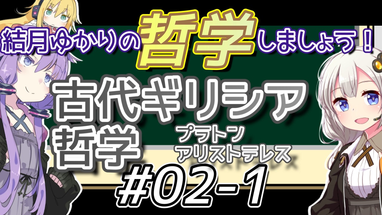 今回は古代ギリシャ哲学。<br>SSスレ出身のプラトンくんと、動物博士のアリストテレスくんです。<br>よければ見ていってください。<br><br><a href="#" class="seekTime" data-seekTime="00:00" onclick="seekNicoPlayer('#00:00'); return false;">#00:00</a> 茶番<br><a href="#" class="seekTime" data-seekTime="01:16" onclick="seekNicoPlayer('#01:16'); return false;">#01:16</a> 本編<br><br>前→ <a href="https://www.nicovideo.jp/watch/sm33920383" class="watch">sm33920383</a><br>次→ <a href="https://www.nicovideo.jp/watch/sm34076898" class="watch">sm34076898</a><br /><strong>Youtube はじめました<br><a href="https://www.youtube.com/channel/UCseCeyYQq6epyNzf1hbm-WQ" target="_blank" rel="noopener nofollow">https://www.youtube.com/channel/UCseCeyYQq6epyNzf1hbm-WQ</a></strong><br><br><strong>【New】</strong><br>「【字幕付き】琴葉姉妹とほしめぐり【VOICEROID劇場】」<br>シリーズ→ <a href="https://www.nicovideo.jp/series/444552" target="_blank" rel="noopener">series/444552</a><br>Part1 → <a href="https://www.nicovideo.jp/watch/sm43090506" class="watch">sm43090506</a><br><br>他シリーズ→ <a href="https://www.nicovideo.jp/series/16986" target="_blank" rel="noopener">series/16986</a><br>「結月ゆかりの哲学しましょう」<br>マイリスト→ <a href="https://www.nicovideo.jp/mylist/63463022" target="_blank" rel="noopener">mylist/63463022</a><br>シリーズ → <a href="https://www.nicovideo.jp/series/16986" target="_blank" rel="noopener">series/16986</a><br>Part1 → <a href="https://www.nicovideo.jp/watch/sm33920383" class="watch">sm33920383</a><br>1分でわかる → <a href="https://www.nicovideo.jp/watch/sm41261724" class="watch">sm41261724</a><br><br>「結月ゆかりの「もっと」哲学しましょう」<br>シリーズ → <a href="https://www.nicovideo.jp/series/351485" target="_blank" rel="noopener">series/351485</a><br>Part1 → <a href="https://www.nicovideo.jp/watch/sm41015164" class="watch">sm41015164</a><br>new1分でわかる → <a href="https://www.nicovideo.jp/watch/sm41195696" class="watch">sm41195696</a><br><br>「【VOICEROID劇場】このアメ玉が溶けるまで」<br>シリーズ → <a href="https://www.nicovideo.jp/series/397530" target="_blank" rel="noopener">series/397530</a><br><br>「【VOICEROID】アンリアルライフ 【アテレコ】」<br>→ <a href="https://www.nicovideo.jp/series/342881" target="_blank" rel="noopener">series/342881</a> <br><br>「【ChatGPTが書く】タカハシ教授の哲学講義【CeVIO劇場】」<br>→ <a href="https://www.nicovideo.jp/series/396449" target="_blank" rel="noopener">series/396449</a><br><br>「【VOICEROID劇場】シラノ・ド・ベルジュラック」<br>→ <a href="https://www.nicovideo.jp/series/518063" target="_blank" rel="noopener">series/518063</a><br>第一幕→ <a href="https://www.nicovideo.jp/watch/sm45011537" class="watch">sm45011537</a>