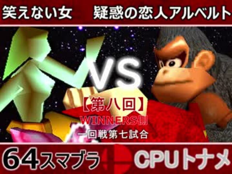 もったいない潰し合い<br>※どちらが勝つかアンケ結果(Twitter調べ) <br>笑えない女(SA) 61% VS 疑惑の恋人アルベルト(DK) 39%<br><br><font color="#0000ff"><u>※64スマブラCPUトナメ実況のwikiができた模様</u>→</font> <a href="https://wiki3.jp/cpu_64" target="_blank" rel="noopener nofollow">https://wiki3.jp/cpu_64</a><br><br><b><font color="#ff0000">決勝トナメのPVを作成していただきました</font></b>【<a href="https://www.nicovideo.jp/watch/sm33974576" class="watch">sm33974576</a>】ありがとうございます!!!<br><b><font size="5"><font color="#ff0000">次→</font></font></b>【<a href="https://www.nicovideo.jp/watch/sm34082108" class="watch">sm34082108</a>】※毎日投稿 <br><br>前【<a href="https://www.nicovideo.jp/watch/sm34072630" class="watch">sm34072630</a>】 一回戦第一試合【<a href="https://www.nicovideo.jp/watch/sm34042071" class="watch">sm34042071</a>】 <br>予選Aブロック第一試合【<a href="https://www.nicovideo.jp/watch/sm33462799" class="watch">sm33462799</a>】 <br>出場選手紹介【<a href="https://www.nicovideo.jp/watch/sm33435891" class="watch">sm33435891</a>】<br> <br>第八回マイリスト【<a href="https://www.nicovideo.jp/mylist/62486112" target="_blank" rel="noopener">mylist/62486112</a>】 <br>64スマブラCPUトナメ実況part1まとめ【<a href="https://www.nicovideo.jp/mylist/60846861" target="_blank" rel="noopener">mylist/60846861</a>】<br>その他シリーズ【<a href="https://www.nicovideo.jp/mylist/12965027" target="_blank" rel="noopener">mylist/12965027</a>】<br><br><b><font color="#00bfff">Twitter</font></b>【<a href="https://twitter.com/niconicopppppp" target="_blank" rel="noopener nofollow">https://twitter.com/niconicopppppp</a> 】<br><b><font color="#ff4500">チャンネル</font></b>【<a href="https://ch.nicovideo.jp/p-desu" target="_blank" rel="noopener">ch.nicovideo.jp/p-desu</a>】