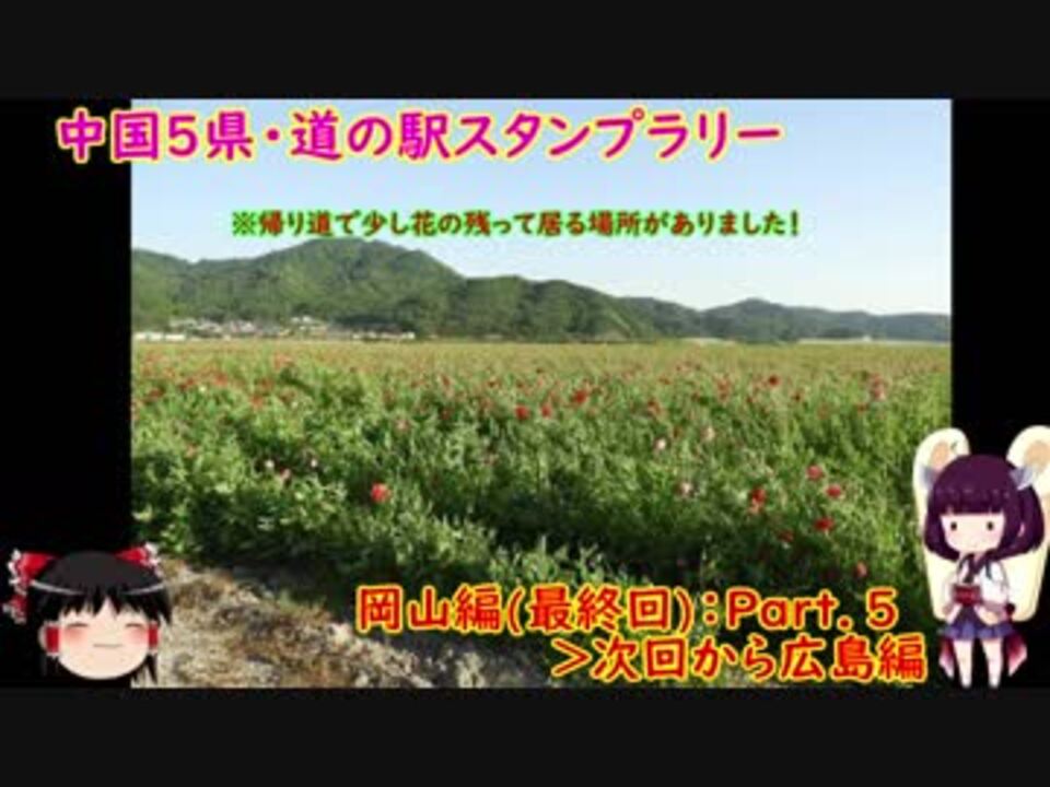 長編企画としてうp主の愛車DEMIOで中国地方5県・道の駅スタンプラリーをやっていきます。 <br>今回で岡山編は最終回です!<br><br>※注意事項※ <br>・ゆっくりボイス、ボイスロイドによる実況<br>・素人編集、素人運転<br>・おっさんのネガティブな自分語り <br>・大小様々なミス<br>・車載動画に偽装した雑談動画<br>許容できない方はブラウザバック推奨です <br><a href="https://www.nicovideo.jp/watch/sm34051315" class="watch">sm34051315</a>←前回(<a href="https://www.nicovideo.jp/mylist/61966822" target="_blank" rel="noopener">mylist/61966822</a>)次回→<a href="https://www.nicovideo.jp/watch/sm34292880" class="watch">sm34292880</a><br>その他の動画:<a href="https://www.nicovideo.jp/mylist/61590379" target="_blank" rel="noopener">mylist/61590379</a><br><br>動画制作環境 <br>動画:HDR-AS50 <br>静画:COOLPIX B700 <br>編集:ゆっくりMovieMaker3 <br> AviUtl <br> PowerDirector16(opのみ) <br><br><使わせていただいた素材> <br>SD東北きりたん :blueberry様【<a href="https://seiga.nicovideo.jp/seiga/im6196095" target="_blank" rel="noopener">im6196095</a>】 <br>ゆっくり霊夢:nicotalk&キャラ素材配布所:ゆっくり素材【www.nicotalk.com/charasozai.html】 <br>効果音等:ニコニコモンズ:【<a href="https://commons.nicovideo.jp/】" target="_blank" rel="noopener nofollow">https://commons.nicovideo.jp/】</a>
