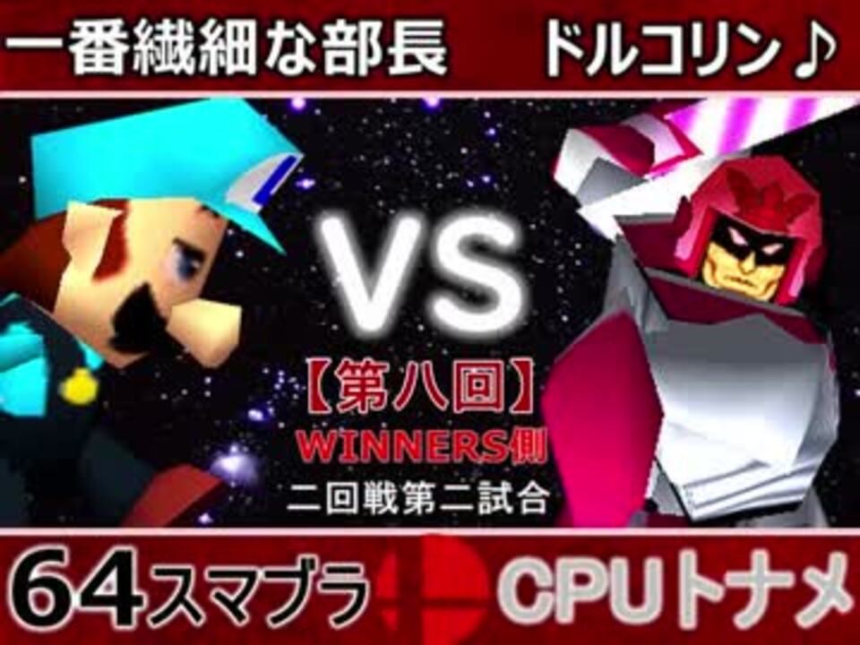 セクハラしたら仕事やめないといけなくなる部長<br>※どちらが勝つかアンケ結果(Twitter調べ) <br>一番繊細な部長(LU) 49% VS ドルコリン♪(FA) 51%<br><br><font color="#0000ff"><u>※64スマブラCPUトナメ実況のwikiができた模様</u>→</font> <a href="https://wiki3.jp/cpu_64" target="_blank" rel="noopener nofollow">https://wiki3.jp/cpu_64</a><br><br><b><font color="#ff0000">決勝トナメのPVを作成していただきました</font></b>【<a href="https://www.nicovideo.jp/watch/sm33974576" class="watch">sm33974576</a>】ありがとうございます!!!<br><b><font size="5"><font color="#ff0000">次→</font></font></b>【<a href="https://www.nicovideo.jp/watch/sm34098497" class="watch">sm34098497</a>】※毎日投稿 <br><br>前【<a href="https://www.nicovideo.jp/watch/sm34087343" class="watch">sm34087343</a>】 一回戦第一試合【<a href="https://www.nicovideo.jp/watch/sm34042071" class="watch">sm34042071</a>】 <br>予選Aブロック第一試合【<a href="https://www.nicovideo.jp/watch/sm33462799" class="watch">sm33462799</a>】 <br>出場選手紹介【<a href="https://www.nicovideo.jp/watch/sm33435891" class="watch">sm33435891</a>】<br> <br>第八回マイリスト【<a href="https://www.nicovideo.jp/mylist/62486112" target="_blank" rel="noopener">mylist/62486112</a>】 <br>64スマブラCPUトナメ実況part1まとめ【<a href="https://www.nicovideo.jp/mylist/60846861" target="_blank" rel="noopener">mylist/60846861</a>】<br>その他シリーズ【<a href="https://www.nicovideo.jp/mylist/12965027" target="_blank" rel="noopener">mylist/12965027</a>】<br><br><b><font color="#00bfff">Twitter</font></b>【<a href="https://twitter.com/niconicopppppp" target="_blank" rel="noopener nofollow">https://twitter.com/niconicopppppp</a> 】<br><b><font color="#ff4500">チャンネル</font></b>【<a href="https://ch.nicovideo.jp/p-desu" target="_blank" rel="noopener">ch.nicovideo.jp/p-desu</a>】