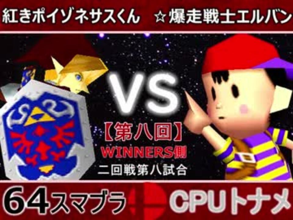 こんなの熱くなるしかないっしょ<br>※どちらが勝つかアンケ結果(Twitter調べ) <br>紅きポイゾネサスくん(LI) 45% VS ☆爆走戦士エルバン(NE) 55%<br><br><font color="#0000ff"><u>※64スマブラCPUトナメ実況のwikiができた模様</u>→</font> <a href="https://wiki3.jp/cpu_64" target="_blank" rel="noopener nofollow">https://wiki3.jp/cpu_64</a><br><br><b><font color="#ff0000">決勝トナメのPVを作成していただきました</font></b>【<a href="https://www.nicovideo.jp/watch/sm33974576" class="watch">sm33974576</a>】ありがとうございます!!!<br><b><font size="5"><font color="#ff0000">次→</font></font></b>【<a href="https://www.nicovideo.jp/watch/sm34147095" class="watch">sm34147095</a>】※毎日投稿 <br><br>前【<a href="https://www.nicovideo.jp/watch/sm34102124" class="watch">sm34102124</a>】 一回戦第一試合【<a href="https://www.nicovideo.jp/watch/sm34042071" class="watch">sm34042071</a>】 <br>予選Aブロック第一試合【<a href="https://www.nicovideo.jp/watch/sm33462799" class="watch">sm33462799</a>】 <br>出場選手紹介【<a href="https://www.nicovideo.jp/watch/sm33435891" class="watch">sm33435891</a>】<br> <br>第八回マイリスト【<a href="https://www.nicovideo.jp/mylist/62486112" target="_blank" rel="noopener">mylist/62486112</a>】 <br>64スマブラCPUトナメ実況part1まとめ【<a href="https://www.nicovideo.jp/mylist/60846861" target="_blank" rel="noopener">mylist/60846861</a>】<br>その他シリーズ【<a href="https://www.nicovideo.jp/mylist/12965027" target="_blank" rel="noopener">mylist/12965027</a>】<br><br><b><font color="#00bfff">Twitter</font></b>【<a href="https://twitter.com/niconicopppppp" target="_blank" rel="noopener nofollow">https://twitter.com/niconicopppppp</a> 】<br><b><font color="#ff4500">チャンネル</font></b>【<a href="https://ch.nicovideo.jp/p-desu" target="_blank" rel="noopener">ch.nicovideo.jp/p-desu</a>】
