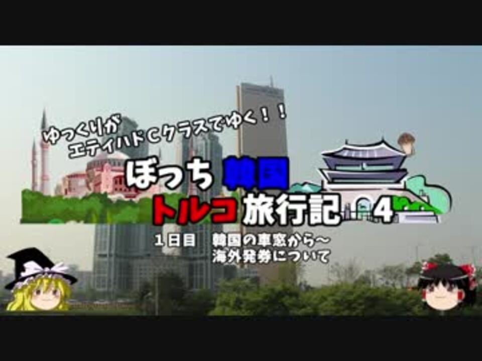 <font color="#ff0000" size="4"><u>※Youtubeで1話分、先行配信中 </u></font><br><font color="#0000ff" size="4"> <a href="http://www.youtube.com/c/なめこのぼっち旅" target="_blank" rel="noopener nofollow">http://www.youtube.com/c/なめこのぼっち旅</a></font> <br><br><b> </b>今回は終始車窓、そして解説回です。<br>何故今回、韓国とトルコを旅したのか?<br>あと、海外発券についても説明します。<br><br>第1話→<a href="https://www.nicovideo.jp/watch/sm34047420" class="watch">sm34047420</a><br><br>第1章・・・韓国観光編<font color="#ff0000">←今ココ</font><br> 第2章・・・出発編<br> 第3章・・・トルコ観光編<br> 第4章・・・帰路編<br><br><font color="#ff0000">コミュニティー→co2910020</font><br> twitter→<a href="https://twitter.com/ryontan" target="_blank" rel="noopener nofollow">https://twitter.com/ryontan</a><br><br><a href="https://www.nicovideo.jp/watch/sm34081641" class="watch">sm34081641</a>←前回 <font color="#ff0000">次回 5話→<a href="https://www.nicovideo.jp/watch/sm34117051" class="watch">sm34117051</a></font><br><br>解説・雑談系→<a href="https://www.nicovideo.jp/mylist/63171869" target="_blank" rel="noopener">mylist/63171869</a><br>今作 韓国トルコ旅行記→<a href="https://www.nicovideo.jp/mylist/63654428" target="_blank" rel="noopener">mylist/63654428</a><br>今作 車中泊旅行記→<a href="https://www.nicovideo.jp/mylist/54706524" target="_blank" rel="noopener">mylist/54706524</a><br>前作 久米島(沖縄)旅行記→<a href="https://www.nicovideo.jp/mylist/63059251" target="_blank" rel="noopener">mylist/63059251</a><br><b></b>イギリスタイ旅行記→<a href="https://www.nicovideo.jp/mylist/60044833" target="_blank" rel="noopener">mylist/60044833</a><br>クルーズ旅行記→<a href="https://www.nicovideo.jp/mylist/57397685" target="_blank" rel="noopener">mylist/57397685</a><br>ドイツ周遊記→<a href="https://www.nicovideo.jp/mylist/54938346" target="_blank" rel="noopener">mylist/54938346</a><br>北海道旅行記→<a href="https://www.nicovideo.jp/mylist/52618057" target="_blank" rel="noopener">mylist/52618057</a><br>アメリカ横断記→<a href="https://www.nicovideo.jp/mylist/48621785" target="_blank" rel="noopener">mylist/48621785</a><br>イタリア周遊記→<a href="https://www.nicovideo.jp/mylist/45763559" target="_blank" rel="noopener">mylist/45763559</a><br>NY旅行記→<a href="https://www.nicovideo.jp/mylist/44343854" target="_blank" rel="noopener">mylist/44343854</a><font color="#ff0000" size="5"><font color="#000000" size="2"><br></font></font>