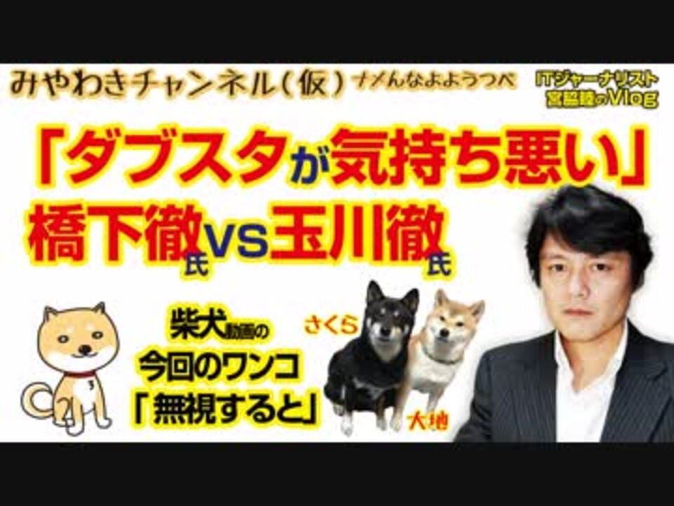 2018年11月1日テレビ朝日「モーニングショー」で、シリアにて拘束された安田純平氏を「英雄」のように評価していた、玉川徹テレビ朝日社員。これを否定する橋下徹氏との「討論」が行われた。噛み合わぬ議論の中、繰り返されたのは「ダブスタ」だ。経済評論家の上念司氏はこう唾棄する。「あいつらのダブスタが気持ち悪い」と。<br><br>マスコミでは言えないこと#260Restart0104<br>オリジナル2018年11月1日配信<br><br>番組の最後に「柴犬」のコーナーがあります。<br>今回のワンコ「無視すると」<br><br><br>■わんこ総集編はこちらから!<br>何かあっても大丈夫、のはず。仮にこの「ワンコチャンネル」になにかあれば・・・オッス、○○と。<br>今回のワンコ総集編〜さくら&大地〜<br><a href="https://www.youtube.com/channel/UChwY..." target="_blank" rel="noopener nofollow">https://www.youtube.com/channel/UChwY...</a><br><br>■ニコニコ動画<br><a href="http://www.nicovideo.jp/user/13610165" target="_blank" rel="noopener nofollow">http://www.nicovideo.jp/user/13610165</a><br>■FRESH LIVE<br><a href="https://freshlive.tv/miyawaki-ch" target="_blank" rel="noopener nofollow">https://freshlive.tv/miyawaki-ch</a><br>■FC2動画<br><a href="https://video.fc2.com/account/16696711" target="_blank" rel="noopener nofollow">https://video.fc2.com/account/16696711</a><br>■YouTube(理不尽に消えることあり)<br><a href="https://www.youtube.com/c/AtsushiMiyawaki" target="_blank" rel="noopener nofollow">https://www.youtube.com/c/AtsushiMiyawaki</a><br><br>■いつ「消える」かわかりません。<br>そこでオフィシャルサイトで「非常用連絡先」をご確認ください。<br>「みやチャン(仮)」公式サイト「MiyawakiNewsNetwork」<br><a href="http://www.miyawakiatsushi.net" target="_blank" rel="noopener nofollow">http://www.miyawakiatsushi.net</a><br><br>■理不尽に消えたとき、以下で情報配信しております。ぜひ、ご登録ください。<br><br>■ツイッター<br><a href="https://twitter.com/miyawakiatsushi" target="_blank" rel="noopener nofollow">https://twitter.com/miyawakiatsushi</a><br>■Facebook<br><a href="https://www.facebook.com/miyawakiatsushi" target="_blank" rel="noopener nofollow">https://www.facebook.com/miyawakiatsushi</a>