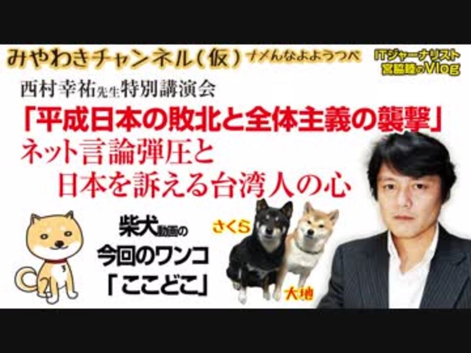 平成30年10月27日に開催された西村幸祐先生特別講演会「平成日本の敗北と全体主義の襲撃」の内容を、ITジャーナリスト宮脇睦が要点解説。なぜ、台湾人は日本を訴えるというのか。<br><br><br><br>マスコミでは言えないこと#262Restart0106<br>オリジナル2018年11月3日配信<br> <br>番組の最後に「柴犬」のコーナーがあります。<br>今回のワンコ「ここどこ」<br><br><br>■わんこ総集編はこちらから!<br>何かあっても大丈夫、のはず。仮にこの「ワンコチャンネル」になにかあれば・・・オッス、○○と。<br>今回のワンコ総集編〜さくら&大地〜<br><a href="https://www.youtube.com/channel/UChwY..." target="_blank" rel="noopener nofollow">https://www.youtube.com/channel/UChwY...</a><br><br>■ニコニコ動画<br><a href="http://www.nicovideo.jp/user/13610165" target="_blank" rel="noopener nofollow">http://www.nicovideo.jp/user/13610165</a><br>■FRESH LIVE<br><a href="https://freshlive.tv/miyawaki-ch" target="_blank" rel="noopener nofollow">https://freshlive.tv/miyawaki-ch</a><br>■FC2動画<br><a href="https://video.fc2.com/account/16696711" target="_blank" rel="noopener nofollow">https://video.fc2.com/account/16696711</a><br>■YouTube(理不尽に消えることあり)<br><a href="https://www.youtube.com/c/AtsushiMiyawaki" target="_blank" rel="noopener nofollow">https://www.youtube.com/c/AtsushiMiyawaki</a><br><br>■いつ「消える」かわかりません。<br>そこでオフィシャルサイトで「非常用連絡先」をご確認ください。<br>「みやチャン(仮)」公式サイト「MiyawakiNewsNetwork」<br><a href="http://www.miyawakiatsushi.net" target="_blank" rel="noopener nofollow">http://www.miyawakiatsushi.net</a><br><br>■理不尽に消えたとき、以下で情報配信しております。ぜひ、ご登録ください。<br><br>■ツイッター<br><a href="https://twitter.com/miyawakiatsushi" target="_blank" rel="noopener nofollow">https://twitter.com/miyawakiatsushi</a><br>■Facebook<br><a href="https://www.facebook.com/miyawakiatsushi" target="_blank" rel="noopener nofollow">https://www.facebook.com/miyawakiatsushi</a>