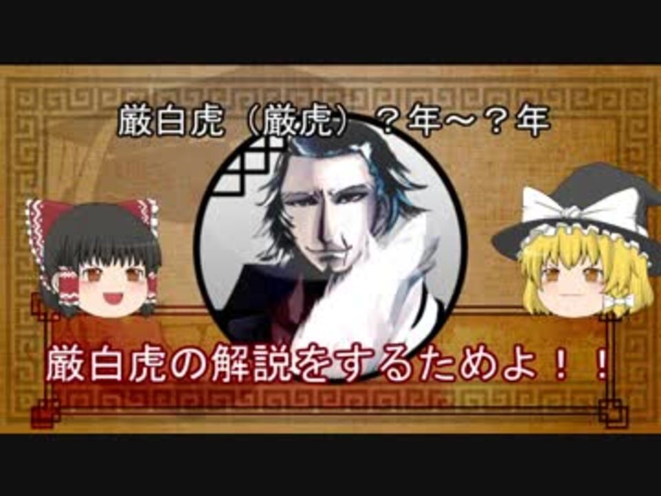 この動画は東方projectの二次創作です。AquesTalkライセンス購入済み。<br> <br><span style="color: #000000; font-size: 14px;">◇反三国志二次創作同人誌「叔漢二國史」</span><span style="color: #006699; font-size: 16px;"><a href="https://danxiawangchao.booth.pm/items/2029329" target="_blank" rel="noopener nofollow">https://danxiawangchao.booth.pm/items/2029329</a></span><br><br>三国志のメジャーではないけど面白い人物やもっと評価される人物を紹介していきます。 <br>大変長らくお待たせいたしました。<br>孫策の江東平定に登場し、強いインパクトを残して流星のように消えていった男厳白虎。<br>彼の活躍とその背後にあったものを追っていきたいと思います。<br><br>▷第十一回「諸葛瞻」前編<a href="https://www.nicovideo.jp/watch/sm33631944" class="watch">sm33631944</a><br> 後編<a href="https://www.nicovideo.jp/watch/sm33799915" class="watch">sm33799915</a><br>▷第十三回「周小史」<a href="https://www.nicovideo.jp/watch/sm34402542" class="watch">sm34402542</a><br><br>◆◆◆◆◆◆◆◆◆◆◆◆◆◆◆<br>参考文献、補足など<br>亶夏王朝府 <a href="https://danxiawangchao.hatenablog.com/" target="_blank" rel="noopener nofollow">https://danxiawangchao.hatenablog.com/</a> <br>この動画の参考文献 <a href="https://danxiawangchao.hatenablog.com/entry/2018/11/05/234629" target="_blank" rel="noopener nofollow">https://danxiawangchao.hatenablog.com/entry/2018/11/05/234629</a><br>補足<strong> </strong><a href="https://danxiawangchao.hatenablog.com/entry/2018/11/11/030433" target="_blank" rel="noopener nofollow">https://danxiawangchao.hatenablog.com/entry/2018/11/11/030433</a><br><br>この動画のイラストまとめ<br>Pixiv <a href="https://www.pixiv.net/member_illust.php?mode=medium&illust_id=71527127" target="_blank" rel="noopener nofollow">https://www.pixiv.net/member_illust.php?mode=medium&illust_id=71527127</a><br>ニコニコ静画 <span style="color: #000000; font-size: 13px;"><a href="https://seiga.nicovideo.jp/user/illust/598620" target="_blank" rel="noopener">user/illust/598620</a></span><br>BOOTH <a href="https://danxiawangchao.booth.pm/" target="_blank" rel="noopener nofollow">https://danxiawangchao.booth.pm/</a><br><br>YouTubeにもアップロードしています。よろしければ評価、チャンネル登録よろしくお願いします。 <br><a href="https://youtu.be/X2dKfnEX4k0" target="_blank" rel="noopener nofollow">https://youtu.be/X2dKfnEX4k0</a> <br>◆◆◆◆◆◆◆◆◆◆◆◆◆◆◆<br><br>音楽効果音提供(敬称略)<br>チンドン演歌/稿屋 隆 <a href="https://dova-s.jp/bgm/play8594.html" target="_blank" rel="noopener nofollow">https://dova-s.jp/bgm/play8594.html</a><br>月下盛宴 /龍的交響楽 <a href="http://d-symphony.com/index.html" target="_blank" rel="noopener nofollow">http://d-symphony.com/index.html</a><br>効果音ラボ <a href="https://soundeffect-lab.info/agreement/" target="_blank" rel="noopener nofollow">https://soundeffect-lab.info/agreement/</a>