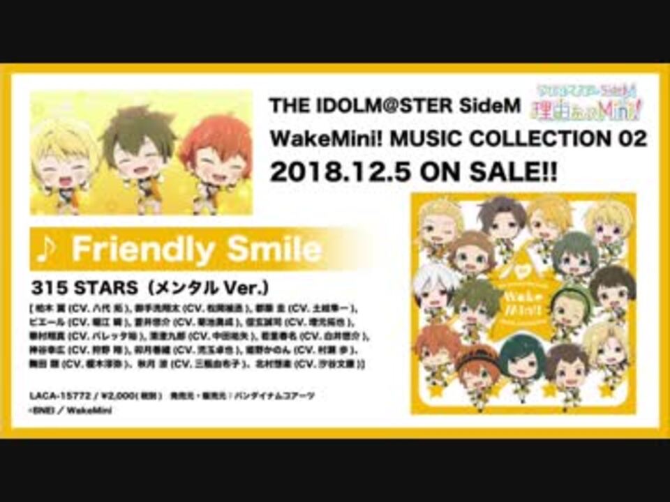 <a href="https://youtu.be/K2Zo7YhtjPQ" target="_blank" rel="noopener nofollow">https://youtu.be/K2Zo7YhtjPQ</a><br><br>2018年10月より、TVアニメ『アイドルマスター SideM 理由あってMini!』放送中!<br>エンディング主題歌第二弾は315 STARS(メンタル Ver.)が歌う「Friendly Smile」!!<br><br><br>THE IDOLM@STER SideM WakeMini! MUSIC COLLECTION 02<br>2018年12月5日(水)発売<br>LACA-15772 / ¥2,000(税別)<br><br>歌:315 STARS(メンタル Ver.)<br>[柏木 翼(CV.八代 拓), 御手洗翔太(CV.松岡禎丞), 都築 圭(CV.土岐隼一), ピエール(CV.堀江 瞬), 蒼井悠介(CV.菊池勇成), 信玄誠司(CV.増元拓也), 華村翔真(CV.バレッタ裕), 清澄九郎(CV.中田祐矢), 若里春名(CV.白井悠介), 神谷幸広(CV.狩野 翔), 卯月巻緒(CV.児玉卓也), 姫野かのん(CV.村瀬 歩)、舞田 類(CV.榎木淳弥)、秋月 涼(CV.三瓶由布子)、北村想楽(CV.汐谷文康)]<br><br>-INDEX-<br> <br>01.Friendly Smile<br> 作詞:結城アイラ 作曲・編曲:島崎貴光<br>02.Friendly Smile (Off Vocal)<br><br>その他サウンドトラックを収録!<br><br>TVアニメ「アイドルマスター SideM 理由あってMini!」公式HP:<a href="http://sidem-wakemini.com" target="_blank" rel="noopener nofollow">http://sidem-wakemini.com</a>