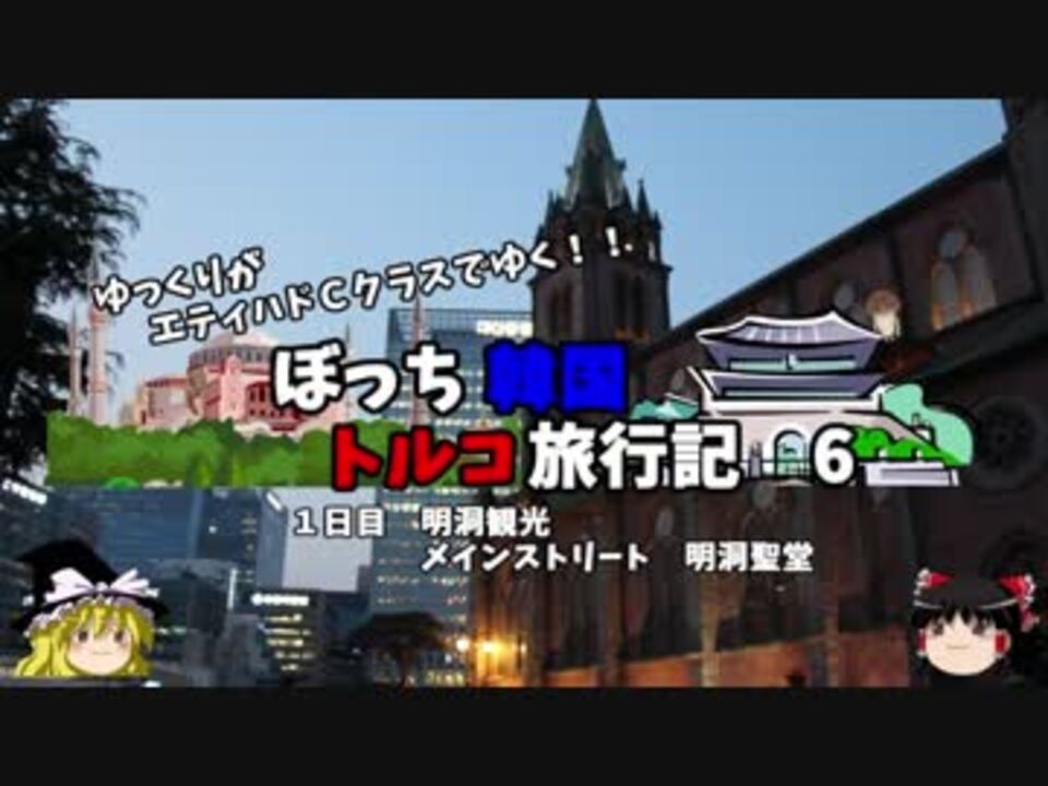 <font color="#ff0000" size="4"><u>※Youtubeで1話分、先行配信中 </u></font><br><font color="#0000ff" size="4"> <a href="http://www.youtube.com/c/なめこのぼっち旅" target="_blank" rel="noopener nofollow">http://www.youtube.com/c/なめこのぼっち旅</a></font> <br><br><b> </b>満腹になったので、明洞のメインストリートを歩いてみましょう。<br>正直、屋台は高いです・・・<br>聖堂はなんか綺麗でした!<br><br>第1話→<a href="https://www.nicovideo.jp/watch/sm34047420" class="watch">sm34047420</a><br><br>第1章・・・韓国観光編<font color="#ff0000">←今ココ</font><br> 第2章・・・出発編<br> 第3章・・・トルコ観光編<br> 第4章・・・帰路編<br><br><font color="#ff0000">コミュニティー→co2910020</font><br> twitter→<a href="https://twitter.com/ryontan" target="_blank" rel="noopener nofollow">https://twitter.com/ryontan</a><br><br><a href="https://www.nicovideo.jp/watch/sm34117051" class="watch">sm34117051</a>←前回 <font color="#ff0000">次回 7話→<a href="https://www.nicovideo.jp/watch/sm34150649" class="watch">sm34150649</a></font><br><br>解説・雑談系→<a href="https://www.nicovideo.jp/mylist/63171869" target="_blank" rel="noopener">mylist/63171869</a><br>今作 韓国トルコ旅行記→<a href="https://www.nicovideo.jp/mylist/63654428" target="_blank" rel="noopener">mylist/63654428</a><br>今作 車中泊旅行記→<a href="https://www.nicovideo.jp/mylist/54706524" target="_blank" rel="noopener">mylist/54706524</a><br>前作 久米島(沖縄)旅行記→<a href="https://www.nicovideo.jp/mylist/63059251" target="_blank" rel="noopener">mylist/63059251</a><br><b></b>イギリスタイ旅行記→<a href="https://www.nicovideo.jp/mylist/60044833" target="_blank" rel="noopener">mylist/60044833</a><br>クルーズ旅行記→<a href="https://www.nicovideo.jp/mylist/57397685" target="_blank" rel="noopener">mylist/57397685</a><br>ドイツ周遊記→<a href="https://www.nicovideo.jp/mylist/54938346" target="_blank" rel="noopener">mylist/54938346</a><br>北海道旅行記→<a href="https://www.nicovideo.jp/mylist/52618057" target="_blank" rel="noopener">mylist/52618057</a><br>アメリカ横断記→<a href="https://www.nicovideo.jp/mylist/48621785" target="_blank" rel="noopener">mylist/48621785</a><br>イタリア周遊記→<a href="https://www.nicovideo.jp/mylist/45763559" target="_blank" rel="noopener">mylist/45763559</a><br>NY旅行記→<a href="https://www.nicovideo.jp/mylist/44343854" target="_blank" rel="noopener">mylist/44343854</a><font color="#ff0000" size="5"><font color="#000000" size="2"><br></font></font>