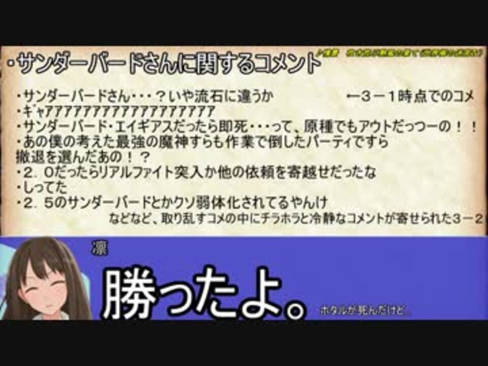 いやあ、サンダーバードは強敵でしたね。<br>動画内容は、冒頭が道中表などの<s>商会</s>紹介、04:02からコメント返し、11:20から次回予告です。<br><br><a href="https://www.nicovideo.jp/watch/sm34148373" class="watch">sm34148373</a>←前 【シリーズマイリス→<a href="https://www.nicovideo.jp/mylist/63376664" target="_blank" rel="noopener">mylist/63376664</a>】 次→<a href="https://www.nicovideo.jp/watch/sm34218591" class="watch">sm34218591</a><br>今まで投稿した動画→<a href="https://www.nicovideo.jp/mylist/61229817" target="_blank" rel="noopener">mylist/61229817</a><br><br>本作は、「グループSNE」及び「株式会社KADOKAWA」が権利を有する<br>『ソード・ワールド2.0/2.5』の、二次創作です。<br>(C)GroupSNE (C)KADOKAWA<br><br>[追記]<br>ロクふみ様、タカ様、aaaaa様、wataru様、パープルP様、お団子様、恵雨様、かめしばP様、まっきー様、キレキレテP様、すてぃ様、PNP様、蒼穹百景様、擬態人形P様、eso様、kenichi様、Seelacanth様、㌧さん様、コオロギ様、マガミ(シリ虐灯台守P)様、ganryuukozirou様、かぜ様、アホ毛P様、緑青様、広告ありがとうございます!<br><br>「気絶中の生死判定」が起こった状況を補足説明すると、「ヒロミ気絶中に前衛が雷鳴食らって、ホタル死亡、ノノノ気絶、ヒロミが再判定で6ゾロ出して復活」。次の手番でノノノにアウェイクンポーション使ってノノノの攻撃で撃破…だったので、「再判定が起こらない(=範囲攻撃に気絶中のキャラが巻き込まれない)」場合、パーティは全滅です。2.0の鳥と戦っちゃダメ。<br>[ちょっと補足]2.0サンダーバードとの激戦について、セッション4反省会でもちょこっと取り上げました。結論から言えば勝ったのは奇跡。