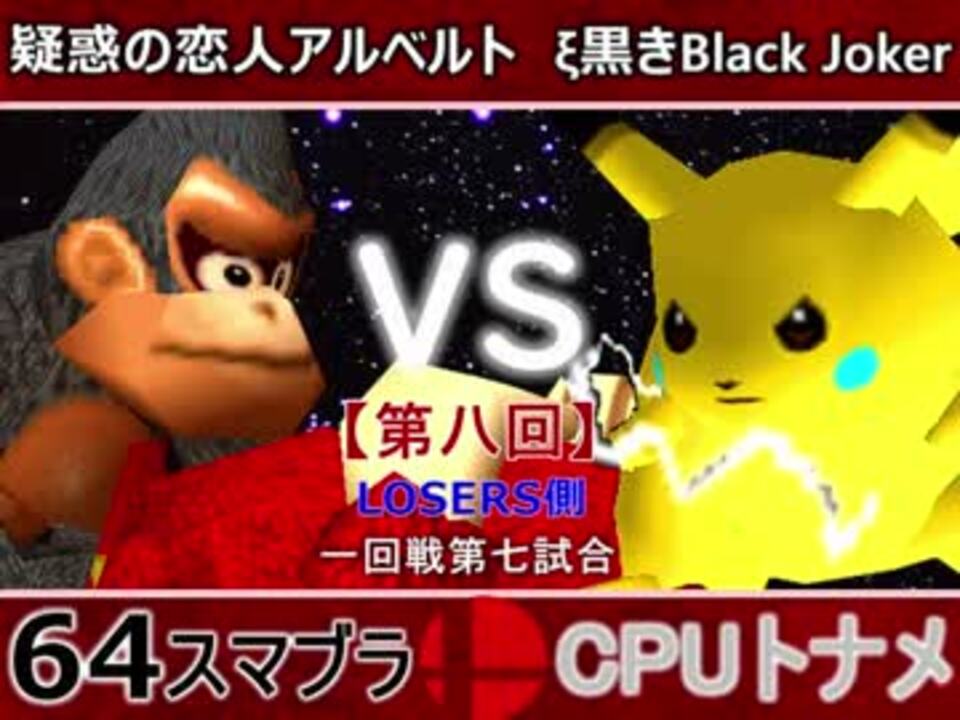 ドンキー勢のエース対ピカチュウ勢のエース<br>どちらが勝つかアンケ結果(Twitter調べ) <br>疑惑の恋人アルベルト(DK) 27% VS ξ黒きBlack Joker(PI) 73%<br><br><font color="#0000ff"><u>※64スマブラCPUトナメ実況のwikiができた模様</u>→</font> <a href="https://wiki3.jp/cpu_64" target="_blank" rel="noopener nofollow">https://wiki3.jp/cpu_64</a><br><br><b><font color="#ff0000">決勝トナメのPVを作成していただきました</font></b>【<a href="https://www.nicovideo.jp/watch/sm33974576" class="watch">sm33974576</a>】ありがとうございます!!!<br><b><font size="5"><font color="#ff0000">次→</font></font></b>【<a href="https://www.nicovideo.jp/watch/sm34180976" class="watch">sm34180976</a>】※毎日投稿 <br><br>前【<a href="https://www.nicovideo.jp/watch/sm34172153" class="watch">sm34172153</a>】 Winners側一回戦第一試合【<a href="https://www.nicovideo.jp/watch/sm34042071" class="watch">sm34042071</a>】 <br>予選Aブロック第一試合【<a href="https://www.nicovideo.jp/watch/sm33462799" class="watch">sm33462799</a>】 <br>出場選手紹介【<a href="https://www.nicovideo.jp/watch/sm33435891" class="watch">sm33435891</a>】<br> <br>第八回マイリスト【<a href="https://www.nicovideo.jp/mylist/62486112" target="_blank" rel="noopener">mylist/62486112</a>】 <br>64スマブラCPUトナメ実況part1まとめ【<a href="https://www.nicovideo.jp/mylist/60846861" target="_blank" rel="noopener">mylist/60846861</a>】<br>その他シリーズ【<a href="https://www.nicovideo.jp/mylist/12965027" target="_blank" rel="noopener">mylist/12965027</a>】<br><br><b><font color="#00bfff">Twitter</font></b>【<a href="https://twitter.com/niconicopppppp" target="_blank" rel="noopener nofollow">https://twitter.com/niconicopppppp</a> 】<br><b><font color="#ff4500">チャンネル</font></b>【<a href="https://ch.nicovideo.jp/p-desu" target="_blank" rel="noopener">ch.nicovideo.jp/p-desu</a>】