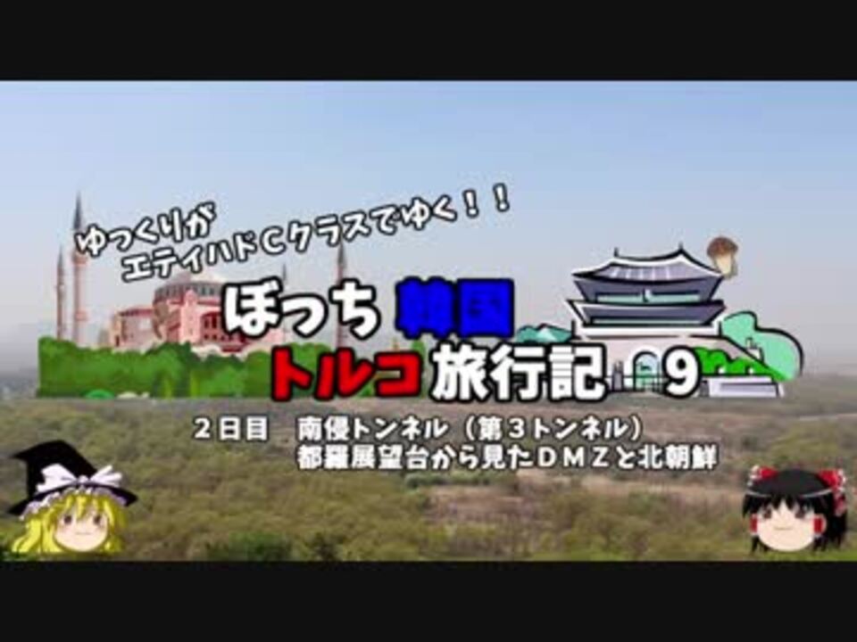 <font color="#ff0000" size="4"><u>※Youtubeで1話分、先行配信中 </u></font><br><font color="#0000ff" size="4"> <a href="http://www.youtube.com/c/なめこのぼっち旅" target="_blank" rel="noopener nofollow">http://www.youtube.com/c/なめこのぼっち旅</a></font> <br><br><b> </b>今回は観光多め、<br>北朝鮮が秘密裏に掘ったとされる南侵トンネルを見学し、<br>展望台から北朝鮮を眺めます<br><br>第1話→<a href="https://www.nicovideo.jp/watch/sm34047420" class="watch">sm34047420</a><br><br>第1章・・・韓国観光編<font color="#ff0000">←今ココ</font><br> 第2章・・・出発編<br> 第3章・・・トルコ観光編<br> 第4章・・・帰路編<br><br><font color="#ff0000">コミュニティー→co2910020</font><br> twitter→<a href="https://twitter.com/ryontan" target="_blank" rel="noopener nofollow">https://twitter.com/ryontan</a><br><br><a href="https://www.nicovideo.jp/watch/sm34172678" class="watch">sm34172678</a>←前回 <font color="#ff0000">次回 10話→<a href="https://www.nicovideo.jp/watch/sm34206602" class="watch">sm34206602</a></font><br><br>解説・雑談系→<a href="https://www.nicovideo.jp/mylist/63171869" target="_blank" rel="noopener">mylist/63171869</a><br>今作 韓国トルコ旅行記→<a href="https://www.nicovideo.jp/mylist/63654428" target="_blank" rel="noopener">mylist/63654428</a><br>今作 車中泊旅行記→<a href="https://www.nicovideo.jp/mylist/54706524" target="_blank" rel="noopener">mylist/54706524</a><br>前作 久米島(沖縄)旅行記→<a href="https://www.nicovideo.jp/mylist/63059251" target="_blank" rel="noopener">mylist/63059251</a><br><b></b>イギリスタイ旅行記→<a href="https://www.nicovideo.jp/mylist/60044833" target="_blank" rel="noopener">mylist/60044833</a><br>クルーズ旅行記→<a href="https://www.nicovideo.jp/mylist/57397685" target="_blank" rel="noopener">mylist/57397685</a><br>ドイツ周遊記→<a href="https://www.nicovideo.jp/mylist/54938346" target="_blank" rel="noopener">mylist/54938346</a><br>北海道旅行記→<a href="https://www.nicovideo.jp/mylist/52618057" target="_blank" rel="noopener">mylist/52618057</a><br>アメリカ横断記→<a href="https://www.nicovideo.jp/mylist/48621785" target="_blank" rel="noopener">mylist/48621785</a><br>イタリア周遊記→<a href="https://www.nicovideo.jp/mylist/45763559" target="_blank" rel="noopener">mylist/45763559</a><br>NY旅行記→<a href="https://www.nicovideo.jp/mylist/44343854" target="_blank" rel="noopener">mylist/44343854</a><font color="#ff0000" size="5"><font color="#000000" size="2"><br></font></font>