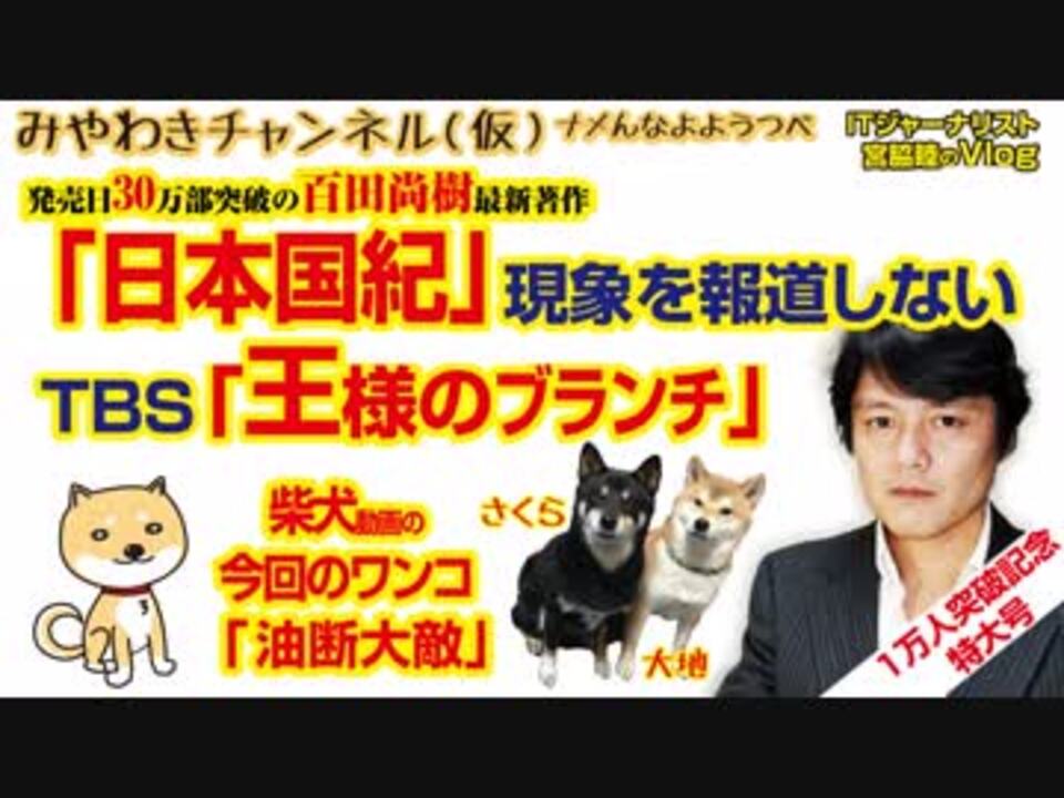 発売日に30万部突破した百田尚樹最新著作「日本国紀」。これはすでに社会現象である。ただ、この「日本国紀現象」を報道しないTBS「王様のブランチ」。<br>ここに「出版不況」の理由を見つける。<br><br>みやわきチャンネル(仮)#276Restart126<br>(マスコミでは言えないこと)#129<br>オリジナル2018年11月2日配信<br><br>番組の最後に「柴犬」のコーナーがあります。<br>今回のワンコ「油断大敵」<br><br><br>■わんこ総集編はこちらから!<br>何かあっても大丈夫、のはず。仮にこの「ワンコチャンネル」になにかあれば・・・オッス、○○と。<br>今回のワンコ総集編〜さくら&大地〜<br><a href="https://www.youtube.com/channel/UChwY..." target="_blank" rel="noopener nofollow">https://www.youtube.com/channel/UChwY...</a><br><br>■ニコニコ動画<br><a href="http://www.nicovideo.jp/user/13610165" target="_blank" rel="noopener nofollow">http://www.nicovideo.jp/user/13610165</a><br>■FRESH LIVE<br><a href="https://freshlive.tv/miyawaki-ch" target="_blank" rel="noopener nofollow">https://freshlive.tv/miyawaki-ch</a><br>■FC2動画<br><a href="https://video.fc2.com/account/16696711" target="_blank" rel="noopener nofollow">https://video.fc2.com/account/16696711</a><br>■YouTube(理不尽に消えることあり)<br><a href="https://www.youtube.com/c/AtsushiMiyawaki" target="_blank" rel="noopener nofollow">https://www.youtube.com/c/AtsushiMiyawaki</a><br><br>■いつ「消える」かわかりません。<br>そこでオフィシャルサイトで「非常用連絡先」をご確認ください。<br>「みやチャン(仮)」公式サイト「MiyawakiNewsNetwork」<br><a href="http://www.miyawakiatsushi.net" target="_blank" rel="noopener nofollow">http://www.miyawakiatsushi.net</a><br><br>■理不尽に消えたとき、以下で情報配信しております。ぜひ、ご登録ください。<br><br>■ツイッター<br><a href="https://twitter.com/miyawakiatsushi" target="_blank" rel="noopener nofollow">https://twitter.com/miyawakiatsushi</a><br>■Facebook<br><a href="https://www.facebook.com/miyawakiatsushi" target="_blank" rel="noopener nofollow">https://www.facebook.com/miyawakiatsushi</a>