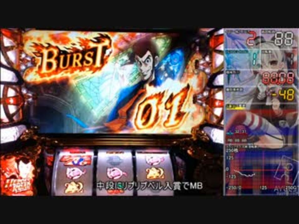 <b>目標<br>・右上がり不二子ZONEを引く(1/16384)<br>・BURST 100達成<br>・一撃2,000枚達成(うp主の最高が1,880枚のため)<br>・HEROES ROADをBURST 0で終了(2枚掛けでの強制終了は禁止)</b><br><br>設定は多分『6』です。<br>販社の人が設定キーを同梱忘れてしまったため、現在確認が出来ていません。<br>次回投稿までには届いているのでわかると思います。<br><br>出玉速度に魅了されて買ってしまいました。<br>打つのに覚えることがやや多いですが、覚えさえすればめちゃくちゃ楽しいし閉店2時間前からでも勝負できる台です。<br>あまり評価されていないのは多分目押しが面倒だったりするのが原因だと思うんですが、ハナビとかバーサスが好きな私にはこれくらいがちょうどいいです。<br><br>初回なので説明多めで動画時間が長くなりました。<br>次回からは短くなる予定なので、ご承知願います。<br><br><font color="#0000ff">広告感謝:紅葵さん、あどみれさん、フェニックス義之さん、kaienさん</font><br><br><font color="#ff0000"> 11/25 追記<br>8:23のところで「この出目はMB or リプレイ小V(二種BB②)」とありますが、チェリーもあります。<br>中を押して中段にベルがテンパイした場合はチェリーとなります。<br>一応投稿者コメントで動画内でも追記しておきました。</font><br><br><a href="https://www.nicovideo.jp/watch/sm34205124" class="watch">sm34205124</a>←TEST 〇 BURST 2→<a href="https://www.nicovideo.jp/watch/sm34222602" class="watch">sm34222602</a><br><br>バーサス(アクロス)→<a href="https://www.nicovideo.jp/mylist/56925499" target="_blank" rel="noopener">mylist/56925499</a><br>世界解剖→<a href="https://www.nicovideo.jp/mylist/63918071" target="_blank" rel="noopener">mylist/63918071</a><br><br>メインの艦こ.れの閣.下実況→<a href="https://www.nicovideo.jp/mylist/53927236" target="_blank" rel="noopener">mylist/53927236</a><br>