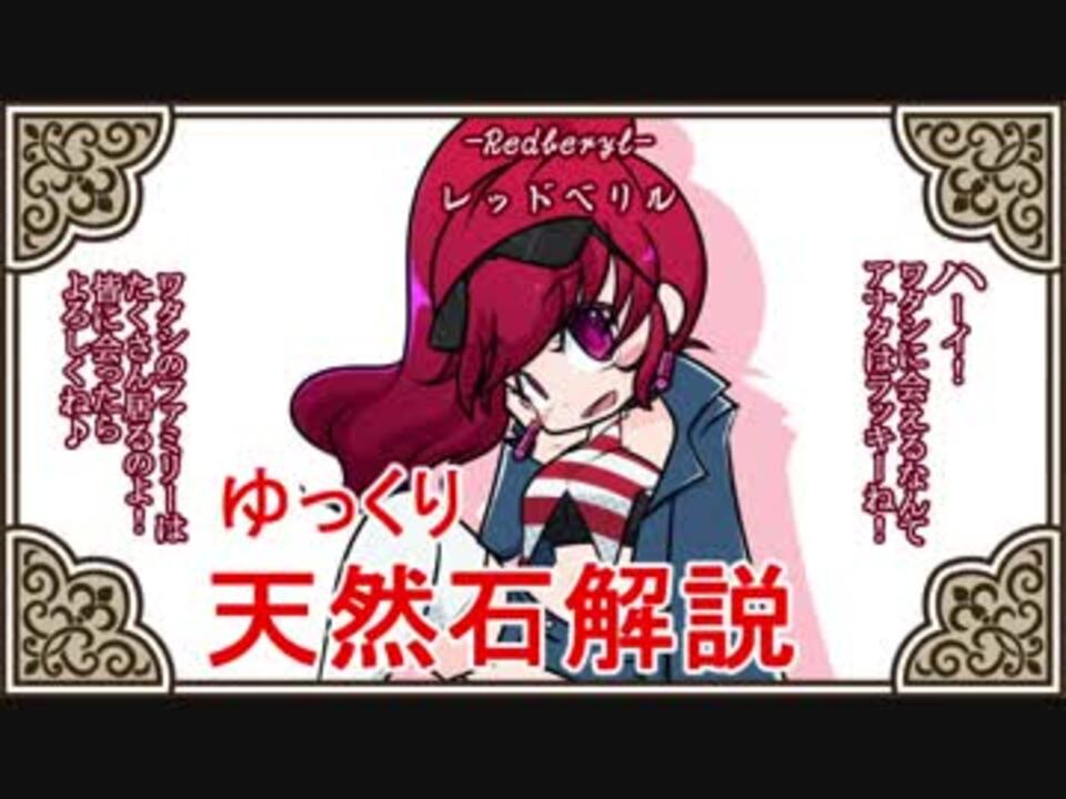 天然石・鉱物・パワーストーンをゆっくり解説していきます。<br><br>リクエストありがとうございます!レッドベリルです。<br><br>この石の有名な産地ワーワー鉱山っていうんだけど、ワーワー山に<br>ベリルっていう地名があるんだよ。<br><br>茶番飛ばし→<a href="#" class="seekTime" data-seekTime="1:41" onclick="seekNicoPlayer('#1:41'); return false;">#1:41</a> ~<br><br>擬人化の全身絵とちょっとした小ネタは静画参照→<a href="https://seiga.nicovideo.jp/seiga/im8726101" target="_blank" rel="noopener">im8726101</a><br><br>前→<a href="https://www.nicovideo.jp/watch/sm34152314" class="watch">sm34152314</a> (part 8 カバンサイト&ペンタゴナイト)<br><br>part 0→<a href="https://www.nicovideo.jp/watch/sm33864263" class="watch">sm33864263</a><br><br>ゆっくり天然石解説マイリス【<a href="https://www.nicovideo.jp/mylist/63380566" target="_blank" rel="noopener">mylist/63380566</a>】<br><br>次→<a href="https://www.nicovideo.jp/watch/sm34269391" class="watch">sm34269391</a> (part 10 ラピスラズリ前編)<br><br><br><br>.:*゚..:。:..:*゚..:。:. 【使用素材】.:*゚:.。:..:*゚:.。:.<br><br><br>背景画像…【creativefreaks】<br><br><a href="http://creativefreaks.net/?lang=ja/" target="_blank" rel="noopener nofollow">http://creativefreaks.net/?lang=ja/</a><br><br><br>BGM …【DOVA-SYNDROME】<br><a href="https://dova-s.jp/" target="_blank" rel="noopener nofollow">https://dova-s.jp/</a><br><br><br>.:*゚..:。:..:*゚..:。:. 【作者Twitter】.:*゚:.。:..:*゚:.。:.<br><br><br><a href="https://twitter.com/nerikeshi_pons" target="_blank" rel="noopener nofollow">https://twitter.com/nerikeshi_pons</a><br><br><br />「いいね」をすると本編シリーズでは「担当擬人化キャラの一言」みたいなお礼?メッセージが、<br>番外編などではきゆくろのつぶやきとかがあります。<br>これと言って誰も得しないシリーズですがうp主の黒歴史を覗き見するつもりでどうぞ。