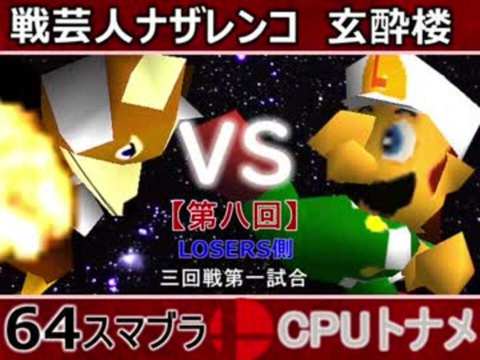 優勝者対決再び!!<br>どちらが勝つかアンケ結果(Twitter調べ) <br>戦芸人ナザレンコ(FO) 35% VS 玄酔楼(LU) 65%<br><br><font color="#0000ff"><u>※64スマブラCPUトナメ実況のwikiができた模様</u>→</font> <a href="https://wiki3.jp/cpu_64" target="_blank" rel="noopener nofollow">https://wiki3.jp/cpu_64</a><br><br><b><font color="#ff0000">決勝トナメのPVを作成していただきました</font></b>【<a href="https://www.nicovideo.jp/watch/sm33974576" class="watch">sm33974576</a>】ありがとうございます!!!<br><b><font size="5"><font color="#ff0000">次→</font></font></b>【<a href="https://www.nicovideo.jp/watch/sm34235592" class="watch">sm34235592</a>】※毎日投稿 <br><br>前【<a href="https://www.nicovideo.jp/watch/sm34224746" class="watch">sm34224746</a>】 Winners側一回戦第一試合【<a href="https://www.nicovideo.jp/watch/sm34042071" class="watch">sm34042071</a>】 <br>予選Aブロック第一試合【<a href="https://www.nicovideo.jp/watch/sm33462799" class="watch">sm33462799</a>】 <br>出場選手紹介【<a href="https://www.nicovideo.jp/watch/sm33435891" class="watch">sm33435891</a>】<br> <br>第八回マイリスト【<a href="https://www.nicovideo.jp/mylist/62486112" target="_blank" rel="noopener">mylist/62486112</a>】 <br>64スマブラCPUトナメ実況part1まとめ【<a href="https://www.nicovideo.jp/mylist/60846861" target="_blank" rel="noopener">mylist/60846861</a>】<br>その他シリーズ【<a href="https://www.nicovideo.jp/mylist/12965027" target="_blank" rel="noopener">mylist/12965027</a>】<br><br><b><font color="#00bfff">Twitter</font></b>【<a href="https://twitter.com/niconicopppppp" target="_blank" rel="noopener nofollow">https://twitter.com/niconicopppppp</a> 】<br><b><font color="#ff4500">チャンネル</font></b>【<a href="https://ch.nicovideo.jp/p-desu" target="_blank" rel="noopener">ch.nicovideo.jp/p-desu</a>】