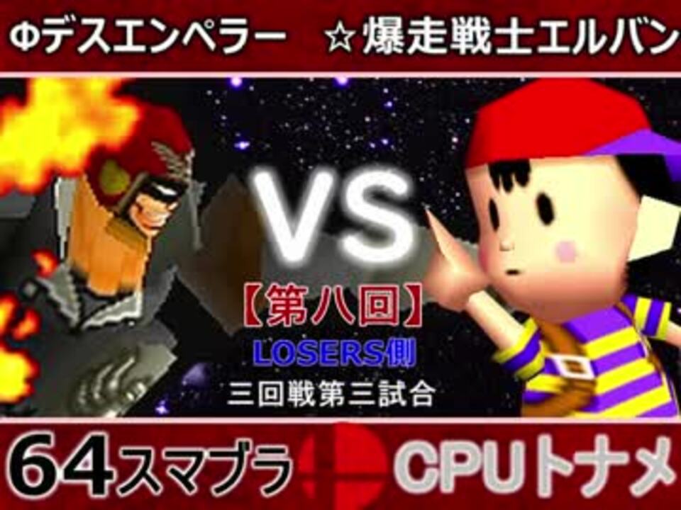 伝統の一戦<br>どちらが勝つかアンケ結果(Twitter調べ) <br>Фデスエンペラー(FA) 26% VS ☆爆走戦士エルバン(NE) 74%<br><br><font color="#0000ff"><u>※64スマブラCPUトナメ実況のwikiができた模様</u>→</font> <a href="https://wiki3.jp/cpu_64" target="_blank" rel="noopener nofollow">https://wiki3.jp/cpu_64</a><br><br><b><font color="#ff0000">決勝トナメのPVを作成していただきました</font></b>【<a href="https://www.nicovideo.jp/watch/sm33974576" class="watch">sm33974576</a>】ありがとうございます!!!<br><b><font size="5"><font color="#ff0000">次→</font></font></b>【11/29(木)19:00】※毎日投稿 <br><br>前【<a href="https://www.nicovideo.jp/watch/sm34235592" class="watch">sm34235592</a>】 Winners側一回戦第一試合【<a href="https://www.nicovideo.jp/watch/sm34042071" class="watch">sm34042071</a>】 <br>予選Aブロック第一試合【<a href="https://www.nicovideo.jp/watch/sm33462799" class="watch">sm33462799</a>】 <br>出場選手紹介【<a href="https://www.nicovideo.jp/watch/sm33435891" class="watch">sm33435891</a>】<br> <br>第八回マイリスト【<a href="https://www.nicovideo.jp/mylist/62486112" target="_blank" rel="noopener">mylist/62486112</a>】 <br>64スマブラCPUトナメ実況part1まとめ【<a href="https://www.nicovideo.jp/mylist/60846861" target="_blank" rel="noopener">mylist/60846861</a>】<br>その他シリーズ【<a href="https://www.nicovideo.jp/mylist/12965027" target="_blank" rel="noopener">mylist/12965027</a>】<br><br><b><font color="#00bfff">Twitter</font></b>【<a href="https://twitter.com/niconicopppppp" target="_blank" rel="noopener nofollow">https://twitter.com/niconicopppppp</a> 】<br><b><font color="#ff4500">チャンネル</font></b>【<a href="https://ch.nicovideo.jp/p-desu" target="_blank" rel="noopener">ch.nicovideo.jp/p-desu</a>】