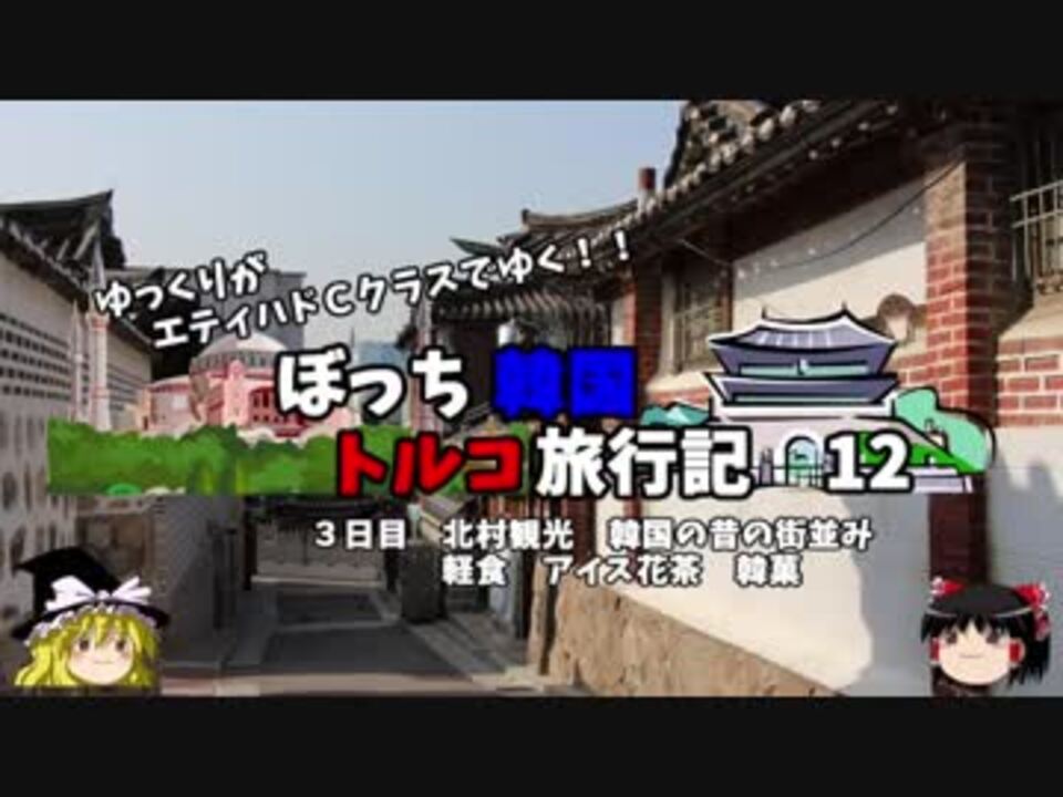 <font color="#ff0000" size="4"><u>※Youtubeで1話分、先行配信中 </u></font><br><font color="#0000ff" size="4"> <a href="http://www.youtube.com/c/なめこのぼっち旅" target="_blank" rel="noopener nofollow">http://www.youtube.com/c/なめこのぼっち旅</a></font> <br><br><b> </b>3日目スタート!<br>本日は夕方まで韓国観光したあと、<br>深夜便でトルコに向かいます!<br>今回は「北村」韓国の昔の街並みを見に行きましょう!<br><br>第1話→<a href="https://www.nicovideo.jp/watch/sm34047420" class="watch">sm34047420</a><br><br>第1章・・・韓国観光編<font color="#ff0000">←今ココ</font><br> 第2章・・・出発編<br> 第3章・・・トルコ観光編<br> 第4章・・・帰路編<br><br><font color="#ff0000">コミュニティー→co2910020</font><br> twitter→<a href="https://twitter.com/ryontan" target="_blank" rel="noopener nofollow">https://twitter.com/ryontan</a><br><br><a href="https://www.nicovideo.jp/watch/sm34218791" class="watch">sm34218791</a>←前回 <font color="#ff0000">次回 13話→<a href="https://www.nicovideo.jp/watch/sm34253238" class="watch">sm34253238</a></font><br><br>解説・雑談系→<a href="https://www.nicovideo.jp/mylist/63171869" target="_blank" rel="noopener">mylist/63171869</a><br>今作 韓国トルコ旅行記→<a href="https://www.nicovideo.jp/mylist/63654428" target="_blank" rel="noopener">mylist/63654428</a><br>今作 車中泊旅行記→<a href="https://www.nicovideo.jp/mylist/54706524" target="_blank" rel="noopener">mylist/54706524</a><br>前作 久米島(沖縄)旅行記→<a href="https://www.nicovideo.jp/mylist/63059251" target="_blank" rel="noopener">mylist/63059251</a><br><b></b>イギリスタイ旅行記→<a href="https://www.nicovideo.jp/mylist/60044833" target="_blank" rel="noopener">mylist/60044833</a><br>クルーズ旅行記→<a href="https://www.nicovideo.jp/mylist/57397685" target="_blank" rel="noopener">mylist/57397685</a><br>ドイツ周遊記→<a href="https://www.nicovideo.jp/mylist/54938346" target="_blank" rel="noopener">mylist/54938346</a><br>北海道旅行記→<a href="https://www.nicovideo.jp/mylist/52618057" target="_blank" rel="noopener">mylist/52618057</a><br>アメリカ横断記→<a href="https://www.nicovideo.jp/mylist/48621785" target="_blank" rel="noopener">mylist/48621785</a><br>イタリア周遊記→<a href="https://www.nicovideo.jp/mylist/45763559" target="_blank" rel="noopener">mylist/45763559</a><br>NY旅行記→<a href="https://www.nicovideo.jp/mylist/44343854" target="_blank" rel="noopener">mylist/44343854</a><font color="#ff0000" size="5"><font color="#000000" size="2"><br></font></font>