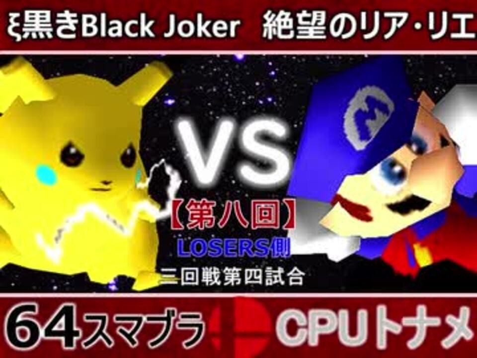 戦績からしても五分・・・!どうなる!?<br>どちらが勝つかアンケ結果(Twitter調べ) <br>ξ黒きBlack Joker(PI) 68% VS 絶望のリア・リエ(MA) 32%<br><br><font color="#0000ff"><u>※64スマブラCPUトナメ実況のwikiができた模様</u>→</font> <a href="https://wiki3.jp/cpu_64" target="_blank" rel="noopener nofollow">https://wiki3.jp/cpu_64</a><br><br><b><font color="#ff0000">決勝トナメのPVを作成していただきました</font></b>【<a href="https://www.nicovideo.jp/watch/sm33974576" class="watch">sm33974576</a>】ありがとうございます!!!<br><b><font size="5"><font color="#ff0000">次→</font></font></b>【<a href="https://www.nicovideo.jp/watch/sm34248680" class="watch">sm34248680</a>】※毎日投稿 <br><br>前【<a href="https://www.nicovideo.jp/watch/sm34236036" class="watch">sm34236036</a>】 Winners側一回戦第一試合【<a href="https://www.nicovideo.jp/watch/sm34042071" class="watch">sm34042071</a>】 <br>予選Aブロック第一試合【<a href="https://www.nicovideo.jp/watch/sm33462799" class="watch">sm33462799</a>】 <br>出場選手紹介【<a href="https://www.nicovideo.jp/watch/sm33435891" class="watch">sm33435891</a>】<br> <br>第八回マイリスト【<a href="https://www.nicovideo.jp/mylist/62486112" target="_blank" rel="noopener">mylist/62486112</a>】 <br>64スマブラCPUトナメ実況part1まとめ【<a href="https://www.nicovideo.jp/mylist/60846861" target="_blank" rel="noopener">mylist/60846861</a>】<br>その他シリーズ【<a href="https://www.nicovideo.jp/mylist/12965027" target="_blank" rel="noopener">mylist/12965027</a>】<br><br><b><font color="#00bfff">Twitter</font></b>【<a href="https://twitter.com/niconicopppppp" target="_blank" rel="noopener nofollow">https://twitter.com/niconicopppppp</a> 】<br><b><font color="#ff4500">チャンネル</font></b>【<a href="https://ch.nicovideo.jp/p-desu" target="_blank" rel="noopener">ch.nicovideo.jp/p-desu</a>】