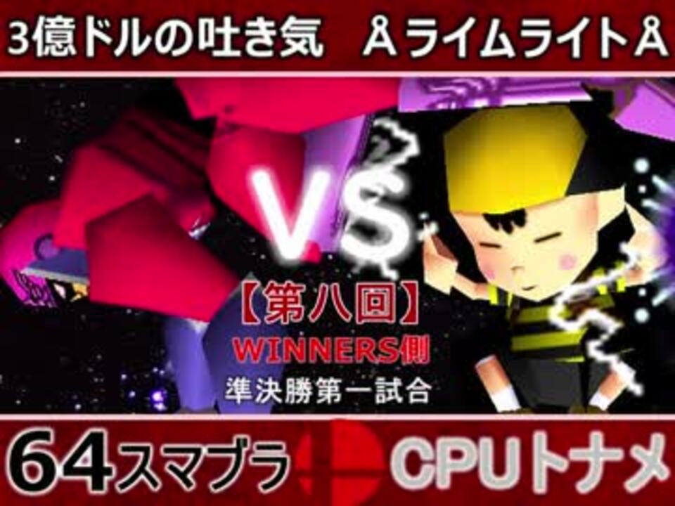 この相性もはや全くわからない!どうなる!?<br>どちらが勝つかアンケ結果(Twitter調べ) <br>3億ドルの吐き気(FA) 64% VS ÅライムライトÅ(NE) 36%<br><br><font color="#0000ff"><u>※64スマブラCPUトナメ実況のwikiができた模様</u>→</font> <a href="https://wiki3.jp/cpu_64" target="_blank" rel="noopener nofollow">https://wiki3.jp/cpu_64</a><br><br><b><font color="#ff0000">決勝トナメのPVを作成していただきました</font></b>【<a href="https://www.nicovideo.jp/watch/sm33974576" class="watch">sm33974576</a>】ありがとうございます!!!<br><b><font size="5"><font color="#ff0000">次→</font></font></b>【<a href="https://www.nicovideo.jp/watch/sm34264653" class="watch">sm34264653</a>】※毎日投稿 <br><br>前【<a href="https://www.nicovideo.jp/watch/sm34248692" class="watch">sm34248692</a>】 Winners側一回戦第一試合【<a href="https://www.nicovideo.jp/watch/sm34042071" class="watch">sm34042071</a>】 <br>予選Aブロック第一試合【<a href="https://www.nicovideo.jp/watch/sm33462799" class="watch">sm33462799</a>】 <br>出場選手紹介【<a href="https://www.nicovideo.jp/watch/sm33435891" class="watch">sm33435891</a>】<br> <br>第八回マイリスト【<a href="https://www.nicovideo.jp/mylist/62486112" target="_blank" rel="noopener">mylist/62486112</a>】 <br>64スマブラCPUトナメ実況part1まとめ【<a href="https://www.nicovideo.jp/mylist/60846861" target="_blank" rel="noopener">mylist/60846861</a>】<br>その他シリーズ【<a href="https://www.nicovideo.jp/mylist/12965027" target="_blank" rel="noopener">mylist/12965027</a>】<br><br><b><font color="#00bfff">Twitter</font></b>【<a href="https://twitter.com/niconicopppppp" target="_blank" rel="noopener nofollow">https://twitter.com/niconicopppppp</a> 】<br><b><font color="#ff4500">チャンネル</font></b>【<a href="https://ch.nicovideo.jp/p-desu" target="_blank" rel="noopener">ch.nicovideo.jp/p-desu</a>】