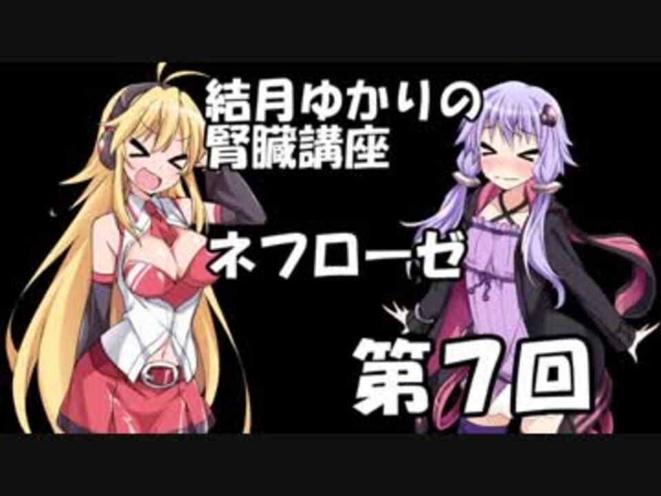 遅くなりました!<br>少しでもペースを上げるため次回予告を省略します。<br><br><font size="3"><font color="#cc0000">注意事項</font><br>①この動画の目的は腎臓の魅力を伝えることです。健康法や治療法などの効能効果を示すものではありません。 心配なことは主治医や専門医に聞いてください。<br>②間違っている内容や既に古い知見となった内容もあるかもしれません。看護学生や医学生が鵜呑みにすると危険です。 <br>③特に笑いはありません。くそ真面目な内容です。</font><br><br>youtubeチャネル:<a href="https://www.youtube.com/channel/UCyyTGpk9WMpKZiJMlmu9gWg" target="_blank" rel="noopener nofollow">https://www.youtube.com/channel/UCyyTGpk9WMpKZiJMlmu9gWg</a><br>結月ゆかりの腎臓講座 第6回(前回):<a href="https://www.nicovideo.jp/watch/sm34082109" class="watch">sm34082109</a>、次回(第8回):<a href="https://www.nicovideo.jp/watch/sm34430718" class="watch">sm34430718</a><br>シリーズマイリスト【 <a href="https://www.nicovideo.jp/mylist/62588759" target="_blank" rel="noopener">mylist/62588759</a> 】 <br><font color="#222222">結月ゆかりの医療用語講座 </font><a href="https://www.nicovideo.jp/watch/sm33309178" class="watch">sm33309178</a> <br><br>使用したもの<br>Aviutl, nicotalk3z, VOICEROID+ 結月ゆかりEX, VOICEROID+ 民安ともえEX<br>立ち絵:たしかなまんぞく様 <br>参考文献:標準腎臓病学、腎生検病理アトラス改訂版、Silva's diagnostic renal pathology、エビデンスに基づくCKD診療ガイドライン2018、CKD診療ガイド2012、腎臓内科クリニカルスタンダード、臨床腎臓病マニュアル、レジデントのための腎臓病診療マニュアル、腎臓病診療レジデントマニュアル 他