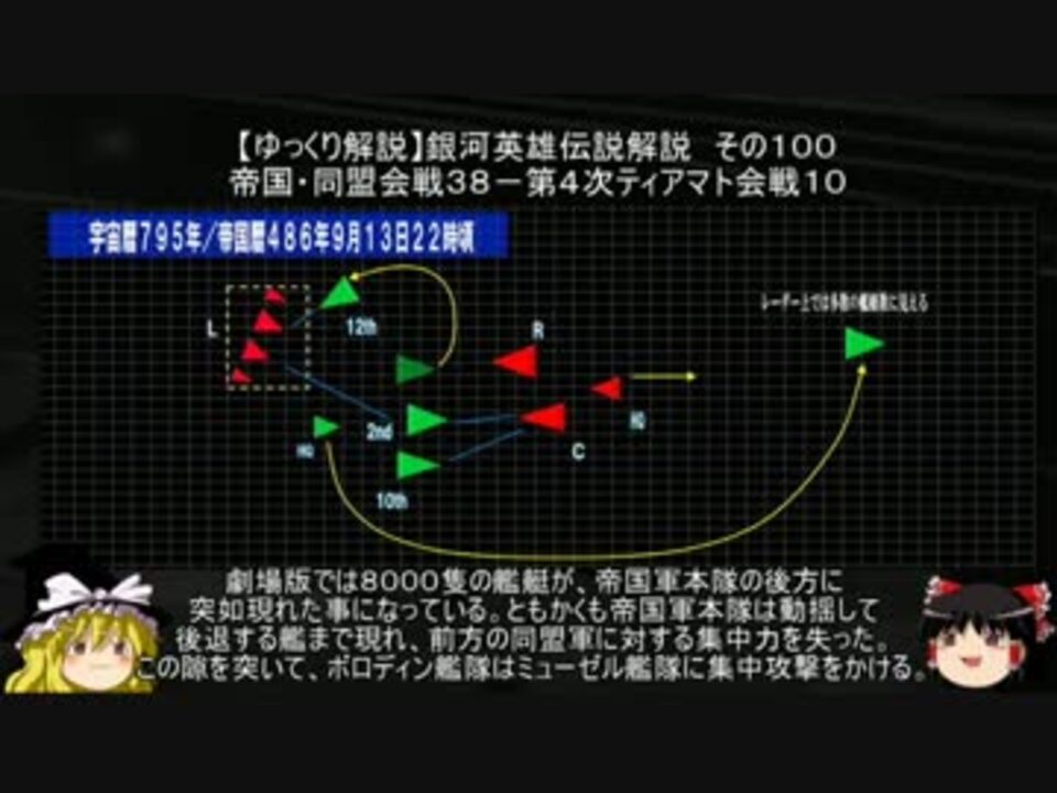 宇宙暦795年/帝国暦486年9月13日13時40分、帝国軍左翼のミューゼル艦隊は、<br>同盟軍3個艦隊の目前で、横断行動を行い、同盟軍首脳部が疑心暗鬼に陥っている間、<br>数十分の間に同盟軍3艦隊の前方の右翼の端から左翼の端までの横断に成功する。<br>ミューゼル艦隊が横断を終えた時、帝国軍本隊と同盟軍の距離は相当に縮まり、両軍はいきなり近接戦闘で戦いが始まった。<br>両軍は意図せず総力戦の形になり、激しい消耗戦となって行った。ミューゼル艦隊は横断完了後、<br>左斜めに針路を取り、安全圏に達した所で、艦隊を反転させて同盟軍左翼のボロディン中将の第12艦隊を攻める。<br>左翼艦隊が敵の左翼艦隊に攻められる、極めてまれな状況になったが、ボロディン中将は帝国軍本隊と、<br>左翼艦隊に同時に攻められながらも、的確な指揮によって、艦隊の損耗を極力抑えて善戦する。<br>この中で同盟軍の苦戦を打開するため、同盟軍の総参謀長であるドワイト・グリーンヒル大将は、<br>少数の艦で敵の後ろに出て、レーダーを騙して自らの艦艇数を多く見せて、<br>イゼルローン方面への退路を断つ様に見せる作戦を提案する。<br>帝国軍左翼の首脳たちは陽動戦術と即座に見抜いたが、帝国軍本隊は退路を確保するため後退して、<br>前方の同盟軍に対する集中力を失い損害が増していた。<br>この様な状況下で帝国・同盟の両軍は如何に行動したか?<br><br>第001話 <a href="https://www.nicovideo.jp/watch/sm33175734" class="watch">sm33175734</a><br>第101話 <a href="https://www.nicovideo.jp/watch/sm34289998" class="watch">sm34289998</a><br>第099話 <a href="https://www.nicovideo.jp/watch/sm34262656" class="watch">sm34262656</a><br><br>マイリスト <a href="https://www.nicovideo.jp/mylist/12818453" target="_blank" rel="noopener">mylist/12818453</a><br>コミュニティ co3805222<br><br>