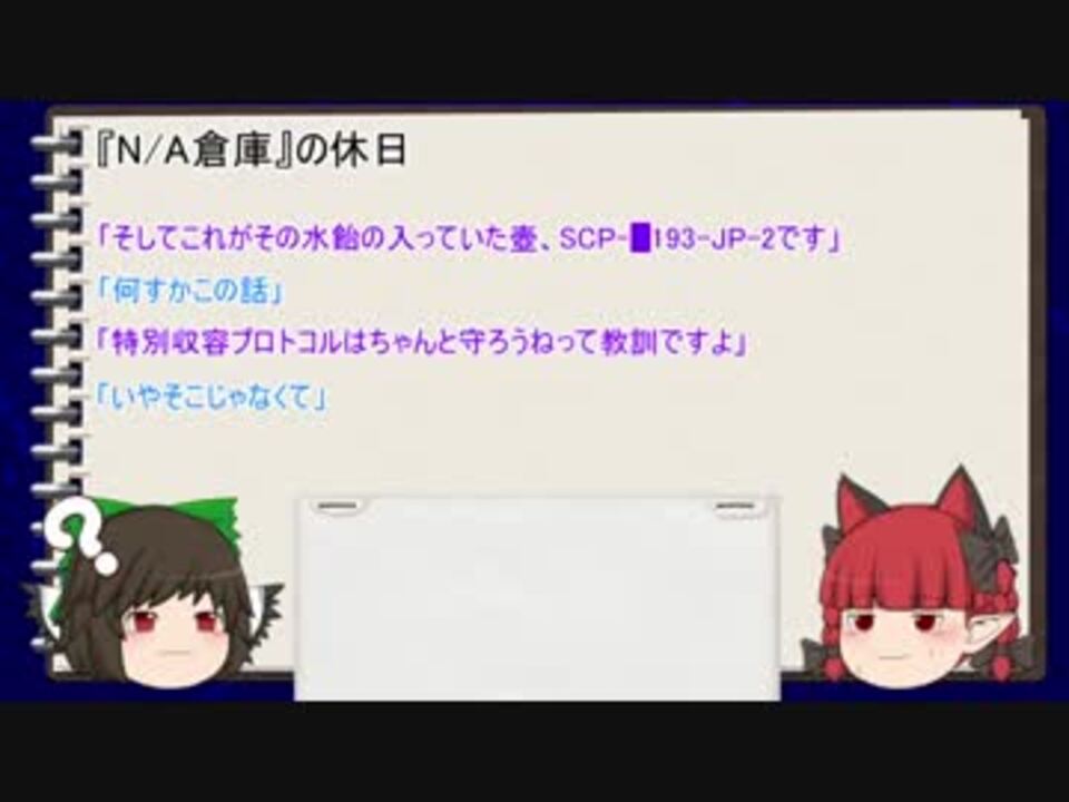 SCP-█193-JP-█の摂取に際して、蓋部分を開放しないよう留意して下さい。<br><br>※大画面推奨です。<br><br>ご紹介させて頂いたSCP<br><br>SCP-414-JP<br><a href="http://ja.scp-wiki.net/scp-414-jp" target="_blank" rel="noopener nofollow">http://ja.scp-wiki.net/scp-414-jp</a><br>SCP-973-JP<br><a href="http://ja.scp-wiki.net/scp-973-jp" target="_blank" rel="noopener nofollow">http://ja.scp-wiki.net/scp-973-jp</a><br>『N/A倉庫』の休日<br><a href="http://ja.scp-wiki.net/agent-of-n-a-souko" target="_blank" rel="noopener nofollow">http://ja.scp-wiki.net/agent-of-n-a-souko</a><br>SCP-1682-JP(旧)<br><span style="font-size: 13px;"><s><a href="http://ja.scp-wiki.net/scp-1682-jp" target="_blank" rel="noopener nofollow">http://ja.scp-wiki.net/scp-1682-jp</a></s></span>(既に削除済)<br><br>SCP財団日本支部<br><a href="http://ja.scp-wiki.net/" target="_blank" rel="noopener nofollow">http://ja.scp-wiki.net/</a><br><br><a href="https://www.nicovideo.jp/watch/sm34278833" class="watch">sm34278833</a>:前編 後編:<a href="https://www.nicovideo.jp/watch/sm34279003" class="watch">sm34279003</a><br><br><a href="https://www.nicovideo.jp/watch/sm33904905" class="watch">sm33904905</a>:前回 [<a href="https://www.nicovideo.jp/mylist/54980618" target="_blank" rel="noopener">mylist/54980618</a>] 次回:<a href="https://www.nicovideo.jp/watch/sm34740028" class="watch">sm34740028</a>