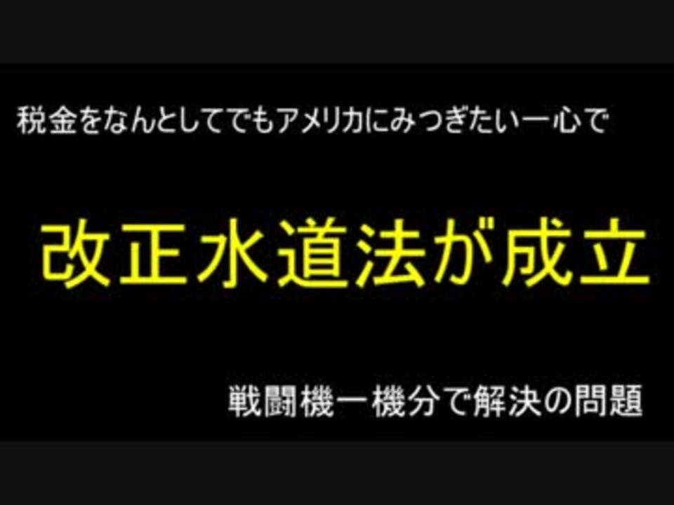 広告ありがとうございます^-^<br>dangoさん takadashuuzoさん トロイの駄馬さん 黒柴さん 木炭さん<br><br>戦闘機100機とかアメリカから買うより、 そのうちの1機を水道インフラに回すだけで<br>解決する問題です。税金を全部アメリカに貢ぎたい安倍さんは売国ですねぇ