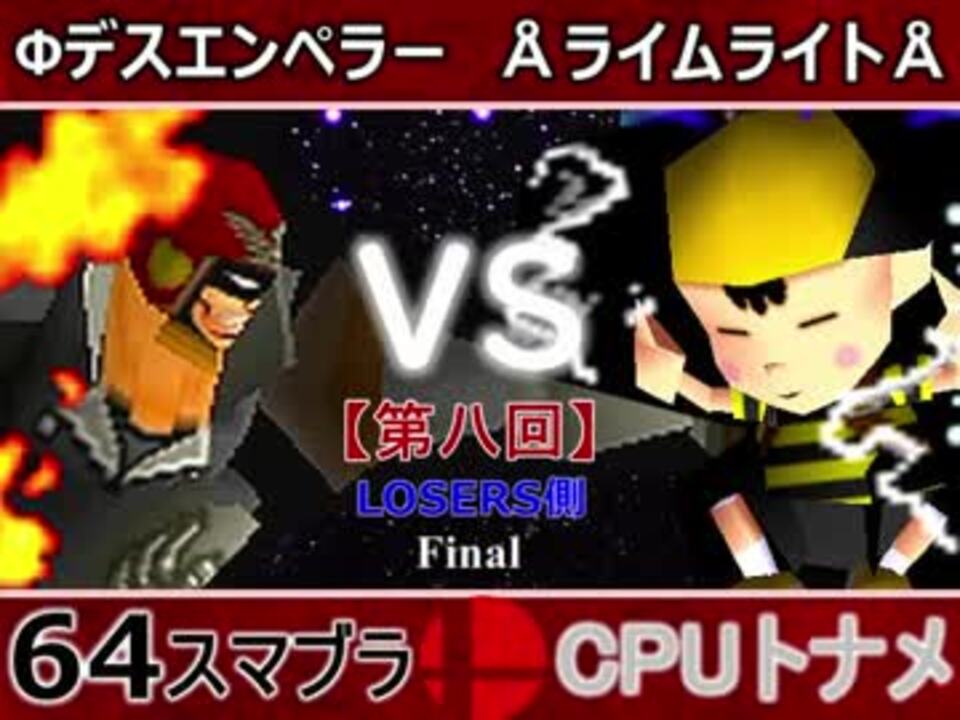 GF進出を決めるのはどっちだ!!<br>どちらが勝つかアンケ結果(Twitter調べ) <br>Фデスエンペラー(FA) 72% VS ÅライムライトÅ(NE) 28%<br><br><font color="#0000ff"><u>※64スマブラCPUトナメ実況のwikiができた模様</u>→</font> <a href="https://wiki3.jp/cpu_64" target="_blank" rel="noopener nofollow">https://wiki3.jp/cpu_64</a><br><br><b><font color="#ff0000">決勝トナメのPVを作成していただきました</font></b>【<a href="https://www.nicovideo.jp/watch/sm33974576" class="watch">sm33974576</a>】ありがとうございます!!!<br><b><font size="5"><font color="#ff0000">次→</font></font></b>【<a href="https://www.nicovideo.jp/watch/sm34295293" class="watch">sm34295293</a>】※毎日投稿 <br><br>前【<a href="https://www.nicovideo.jp/watch/sm34281847" class="watch">sm34281847</a>】 Winners側一回戦第一試合【<a href="https://www.nicovideo.jp/watch/sm34042071" class="watch">sm34042071</a>】 <br>予選Aブロック第一試合【<a href="https://www.nicovideo.jp/watch/sm33462799" class="watch">sm33462799</a>】 <br>出場選手紹介【<a href="https://www.nicovideo.jp/watch/sm33435891" class="watch">sm33435891</a>】<br> <br>第八回マイリスト【<a href="https://www.nicovideo.jp/mylist/62486112" target="_blank" rel="noopener">mylist/62486112</a>】 <br>64スマブラCPUトナメ実況part1まとめ【<a href="https://www.nicovideo.jp/mylist/60846861" target="_blank" rel="noopener">mylist/60846861</a>】<br>その他シリーズ【<a href="https://www.nicovideo.jp/mylist/12965027" target="_blank" rel="noopener">mylist/12965027</a>】<br><br><b><font color="#00bfff">Twitter</font></b>【<a href="https://twitter.com/niconicopppppp" target="_blank" rel="noopener nofollow">https://twitter.com/niconicopppppp</a> 】<br><b><font color="#ff4500">チャンネル</font></b>【<a href="https://ch.nicovideo.jp/p-desu" target="_blank" rel="noopener">ch.nicovideo.jp/p-desu</a>】