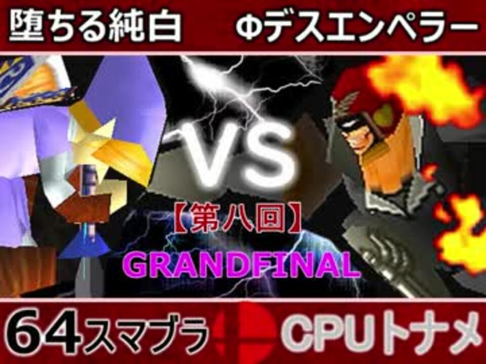 第八回優勝はどっちだぁああああああああ!!!!!<br><b><u> ※ネタバレ防止のため35分という動画時間に設定しています</u></b><br>どちらが勝つかアンケ結果(Twitter調べ) <br>堕ちる純白(LI) 36% VS Фデスエンペラー(FA) 64%<br><br><font color="#0000ff"><u>※64スマブラCPUトナメ実況のwikiができた模様</u>→</font> <a href="https://wiki3.jp/cpu_64" target="_blank" rel="noopener nofollow">https://wiki3.jp/cpu_64</a><br><br><b><font color="#ff0000">決勝トナメのPVを作成していただきました</font></b>【<a href="https://www.nicovideo.jp/watch/sm33974576" class="watch">sm33974576</a>】ありがとうございます!!!<br><b><font size="5"><font color="#ff0000">次→</font></font></b>【<a href="https://www.nicovideo.jp/watch/sm34300426" class="watch">sm34300426</a>】※毎日投稿 <br><br>前【<a href="https://www.nicovideo.jp/watch/sm34287533" class="watch">sm34287533</a>】 Winners側一回戦第一試合【<a href="https://www.nicovideo.jp/watch/sm34042071" class="watch">sm34042071</a>】 <br>予選Aブロック第一試合【<a href="https://www.nicovideo.jp/watch/sm33462799" class="watch">sm33462799</a>】 <br>出場選手紹介【<a href="https://www.nicovideo.jp/watch/sm33435891" class="watch">sm33435891</a>】<br> <br>第八回マイリスト【<a href="https://www.nicovideo.jp/mylist/62486112" target="_blank" rel="noopener">mylist/62486112</a>】 <br>64スマブラCPUトナメ実況part1まとめ【<a href="https://www.nicovideo.jp/mylist/60846861" target="_blank" rel="noopener">mylist/60846861</a>】<br>その他シリーズ【<a href="https://www.nicovideo.jp/mylist/12965027" target="_blank" rel="noopener">mylist/12965027</a>】<br><br><b><font color="#00bfff">Twitter</font></b>【<a href="https://twitter.com/niconicopppppp" target="_blank" rel="noopener nofollow">https://twitter.com/niconicopppppp</a> 】<br><b><font color="#ff4500">チャンネル</font></b>【<a href="https://ch.nicovideo.jp/p-desu" target="_blank" rel="noopener">ch.nicovideo.jp/p-desu</a>】