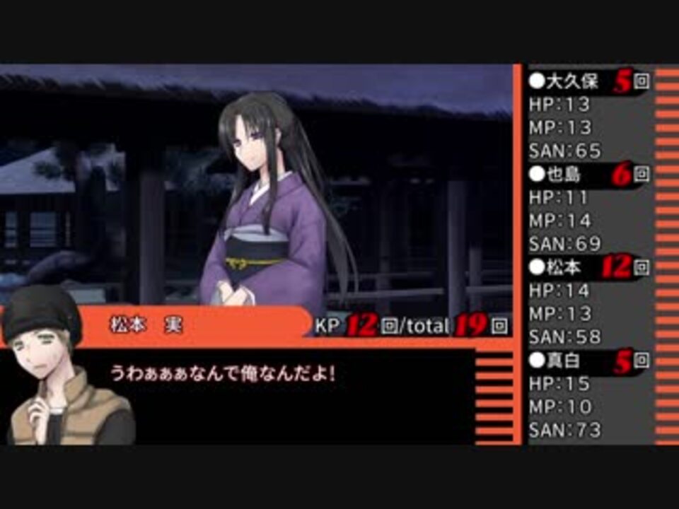 本作は、「 株式会社アークライト 」及び「株式会社KADOKAWA」が権利を有する『クトゥルフ神話TRPG』の二次創作物です。<br><br>Call of Cthulhu is copyright ©1981, 2015, 2019 by Chaosium Inc. ;all rights reserved. Arranged by Arclight Inc.<br>Call of Cthulhu is a registered trademark of Chaosium Inc.<br>PUBLISHED BY KADOKAWA CORPORATION 「クトゥルフ神話TRPG」<br><br>※当シナリオはシナリオ集「月下神話絵巻」に収録されています。<br><a href="https://colorcat.booth.pm/items/1662558" target="_blank" rel="noopener nofollow">https://colorcat.booth.pm/items/1662558</a><br><br><span style="font-size: 18px;">女難の相が出ておるぞ……!</span><br>(言いたかっただけ)<br><br>身内卓を動画化しています。<br>ハウスルールましましで色々緩いですが、ご容赦ください。<br>今回は特殊ルールを用いて、いつも以上に馬鹿やってます。<br><br>また、継続探索者が登場します。<br>先に過去作品を見ていただいた方が、楽しんでいただけると思います。<br>過去作のネタバレも含みますので、何卒ご了承ください。<br>(関連作品:黒薔薇館の怪、共食、土に溺れる、赤の遺言、鬼猫犯科帳、白の囚人、青に染まる夜、探検は危険がいっぱい、軋む籠、ネオンのくすむ街 、閉じられた夢、陽の微笑み、影の嘆き、黒の共演、黄金色の旅路+大正編) <br><span style="font-size: 10px;">多くてすみません。</span><br><br>広告して下さる皆さん、いつもありがとうございます。<br>まとめてのお礼となりまして恐縮ですが、今後とも頑張ります。<br><br>[クトゥルフ動画一覧]<a href="https://www.nicovideo.jp/mylist/60110794" target="_blank" rel="noopener">mylist/60110794</a><br>[part1動画一覧]<a href="https://www.nicovideo.jp/mylist/60289921" target="_blank" rel="noopener">mylist/60289921</a><br>[今作品mylist]<a href="https://www.nicovideo.jp/mylist/63882627" target="_blank" rel="noopener">mylist/63882627</a><br><br>[前]<a href="https://www.nicovideo.jp/watch/sm34307282" class="watch">sm34307282</a><br>[次]<a href="https://www.nicovideo.jp/watch/sm34341560" class="watch">sm34341560</a><br /><br>色猫卓ポータルサイト<br>→<a href="https://marchocias.xsrv.jp/colorcat/index.html" target="_blank" rel="noopener nofollow">https://marchocias.xsrv.jp/colorcat/index.html</a><br>動画で紹介しても良い支援絵は #いろねこあーと で!<br><br>ピッコマで小説連載開始しました!<br>魔族生まれの聖女様!? 著:黒猫ている<br><a href="https://piccoma.com/web/product/156938" target="_blank" rel="noopener nofollow">https://piccoma.com/web/product/156938</a>
