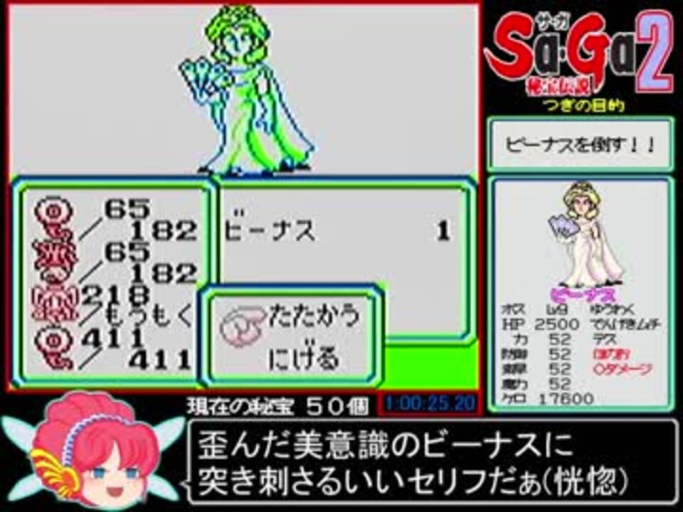 GB初期の名作、Sa・Ga2 秘宝伝説のモンスター縛りRTA、Part2です。 <br>レギュレーション等は長いのでPart1にのみ表記してます。 <br><br>動画内で『しかしあのビーナスの秘宝は~』と言ってますが、下水道の秘宝を回収した後にビーナスに話しかけると彼女がたまげるので、彼女のモノではない可能性が高いですね(すっとぼけてる可能性もありますが)<br>ちなみに本動画で使用しているMAPは自作です。自作といってもネットに上がっていた本作の白黒ゲーム画像MAPに、自分なりに色をつけただけです。が、これに全編集時間の五分の三はつぎ込みました。もっと驚いてくれなきゃ ハリが無ぇがな(改めて見ると地味ですが)<br><br>前<a href="https://www.nicovideo.jp/watch/sm34314491" class="watch">sm34314491</a> 次<a href="https://www.nicovideo.jp/watch/sm34314821" class="watch">sm34314821</a> <a href="https://www.nicovideo.jp/mylist/55290772" target="_blank" rel="noopener">mylist/55290772</a><br><br>追記:宣伝ありがとうございました。やっぱりみんなビーナス好きなんですね。<br> ぼくは嫌いです(割とよく負ける)