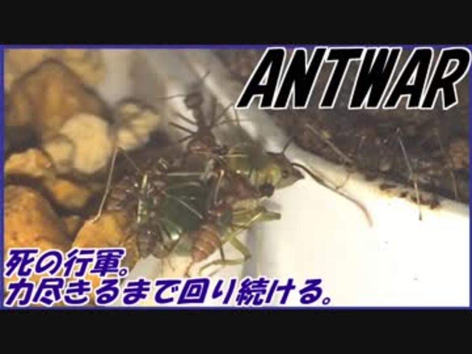 <a href="https://www.nicovideo.jp/watch/sm34322795" class="watch">sm34322795</a>←もどる 次へ→<a href="https://www.nicovideo.jp/watch/sm34357256" class="watch">sm34357256</a><br>火曜・土曜の週2回更新。 <br><br> 蟻戦争マイリスト→<u><a href="https://www.nicovideo.jp/mylist/56298874" target="_blank" rel="noopener">mylist/56298874</a></u><br><br> ∧__∧<br> (・ω・)<私は食べる→寝る→食べる→寝るのデススパイラル。<br><br> 蟻は高度な社会性を持つ昆虫である。<br> ~The ANT is advanced social insect.~<br><br> 卵を産む役、飼育する役、兵隊役などに分かれ、1つのコミュニティを形成する。<br> ~ANTs constitute one comunity.ANTs have the part(childbirth,bring <br> up,military service) in the community.~<br><br> 本来出会わないはずの2つの種族が遭遇した時、我々は彼らの未知なる知性を発見するかもしれない。~ We may discover their intelligences when two species encounter.~