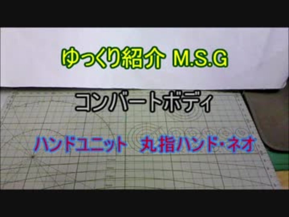 19/5/12 午後11時30分追記<br>M.S.Gハンドユニット紹介のリンクを整理しました。<br><br><br>発売から1週間も経っちゃってすみません。<br>買った日に洗って1日、乾かして1日、組むのに3日、紹介作ってて2日で1週間です。<br>遊んで楽しいキットなのでオススメですよ。……ABSじゃなかったら楽に弄れるのになぁ。<br><br>ついでに丸指ハンド・ネオも紹介です。<br>使用例がコンバートボディじゃないのはオフホワイトの5番機のほうが写真写りが良いからです。<br>…裏話になるが、コンバートボディに丸指ネオを着ける検証をして、<br>写真撮影の前に一旦外そうとしたらハンドの軸が太かったせいでハンドを外せず破損しちゃったんです。<br><br>キット紹介は<a href="#" class="seekTime" data-seekTime="01:22" onclick="seekNicoPlayer('#01:22'); return false;">#01:22</a>からです。<br>なお動画内じゃ言ってないがコンバートボディには、<br>ノーマルハンドBとカスタムハンドBを無改造で使用可能。(どちらも5mmボールジョイントがあるので)<br><br><br>しかし今年は年末にギガンティックアームズが無くてうれしいですよ。アレ、組むだけでも大変だし。<br>「無くて寂しい」と一瞬思ってしまい、<br>「私、毒されてるなぁ」と複雑な気持ちにもなったけど。(^_^ ;)<br><br><br><br>konさん、G.Tさん、HBVー502-H8 ライデンさん、砂ZPさん、<br>キューポッシュ5さい生誕祭紹介の広告ありがとうございます!<br><br><br><br>自己満足シリーズ:<a href="https://www.nicovideo.jp/mylist/57049109" target="_blank" rel="noopener">mylist/57049109</a><br>ノーマルハンドA・B / カスタムハンドA・B紹介:<a href="https://www.nicovideo.jp/watch/sm33939433" class="watch">sm33939433</a><br>丸指ハンドA・B:<a href="https://www.nicovideo.jp/watch/sm35115508" class="watch">sm35115508</a>(19/5/13午前0時公開)<br>ワイルドハンド1・2 / シャープハンド1・2 / ノーマルハンド・ネオ紹介:<a href="https://www.nicovideo.jp/watch/sm32717541" class="watch">sm32717541</a>