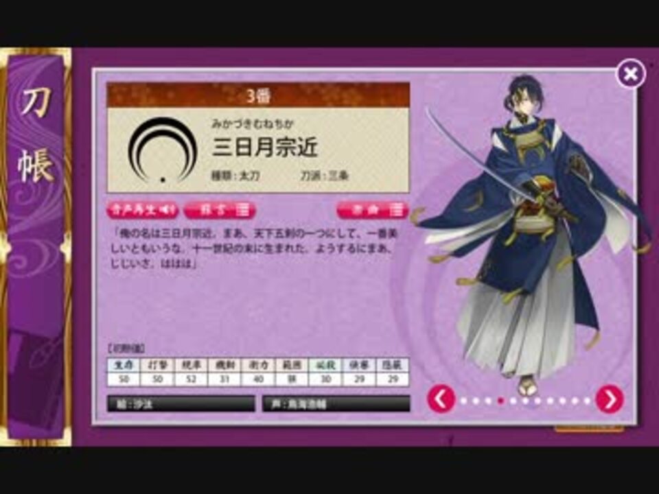 ※特極ごちゃまぜ刀帳順、現在弊本丸にいる73振分。<br>※ネタバレ嫌な人は戻るボタン推奨。太郎さん極めてますのでそっちもバレ注意。<br><br>こういう期間限定ボイス、刀帳とかでいつでも聞き返せればいいのになぁと思う。<br>でもそんな便利機能は存在しない。<br><b>だったら自分で作っちまえ!</b>という自給自足動画。<br><br>PCスペックの関係上、長時間動画撮り続けたまま連隊戦ぶん回すとコマ落ちしまくるので画面は刀帳後付け。<br>一振教本丸ゆえ特極はいずれか一方のみ、詳細は以下の通り。<br><br>・極めてる<br>にっかり青江/平野藤四郎/後藤藤四郎/信濃藤四郎/秋田藤四郎/博多藤四郎/五虎退/薬研藤四郎/千子村正/物吉貞宗/太鼓鐘貞宗/亀甲貞宗/小夜左文字/和泉守兼定/山姥切国広/堀川国広/長曽祢虎徹/大倶利伽羅/へし切長谷部/不動行光/同田貫正国/太郎太刀<br><br>・極めてない(ギブミー修行セット&育成時間)<br>今剣/鳴狐/鯰尾藤四郎/骨喰藤四郎/厚藤四郎/前田藤四郎/乱藤四郎/包丁藤四郎/愛染国俊/宗三左文字/加州清光/大和守安定/歌仙兼定/陸奥守吉行/蜂須賀虎徹/浦島虎徹/次郎太刀<br><br>・そもそも現時点で弊本丸にいない<br>大典太光世/日向正宗/祢々切丸<br><br>[追記]<br>ぶっこ抜きではなくBGM効果音OFFで音声のみダラダラ全録音しつつ25周→後から交代ボイスだけ切り出し。<br><br>[追記2]<br>広告有難うございました。<br><br>[更に追記]<br>特極全員分上げてくださってる方がいらっしゃるので広告等は是非そちらへ…!<br>色々中途半端な動画でマジ申し訳ない。