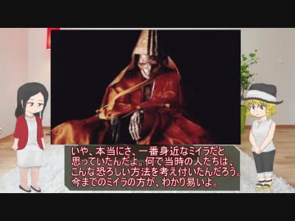 今回紹介するのは、前回の動画でリクエストの多かった即身仏です。 <br>即身仏に関する生成手順は割と知れ渡っている感があったので、<br>この動画では即身仏が登場するまでの背景を中心に解説しています。<br><br>Part 14 >> <a href="https://www.nicovideo.jp/watch/sm33851666" class="watch">sm33851666</a><br>Part 16 >> <a href="https://www.nicovideo.jp/watch/sm34430131" class="watch">sm34430131</a><br><br>他のミイラたち >> <a href="https://www.nicovideo.jp/mylist/56282710" target="_blank" rel="noopener">mylist/56282710</a> <br>AGA解説動画とか >> <a href="https://www.nicovideo.jp/mylist/60046387" target="_blank" rel="noopener">mylist/60046387</a> <br>Voiceroid劇場とか >> <a href="https://www.nicovideo.jp/mylist/64150449" target="_blank" rel="noopener">mylist/64150449</a> <br>動画中の魔理沙と霊夢の画像 >>> <a href="https://seiga.nicovideo.jp/seiga/im5870682" target="_blank" rel="noopener">im5870682</a>、<a href="https://seiga.nicovideo.jp/seiga/im5870690" target="_blank" rel="noopener">im5870690</a>