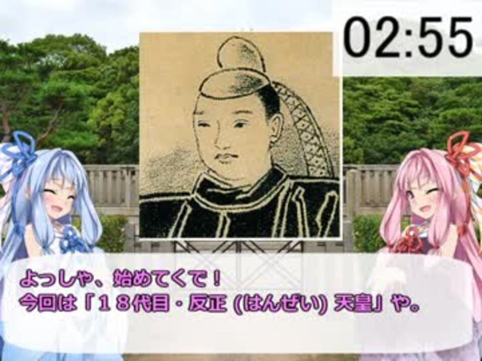 <font color="#ff0000"><font color="#262626">治績よりも容姿の記録の方が残っている珍しい天皇です(おそらくは誇張でしょうが)。<br></font><b></b></font>個人的にソバカリは「古事記・不憫ランキング」上位に来ると思います。<br><br>●反正 (はんぜい)天皇 基本プロフィール <br> 父 仁徳天皇 (第三皇子) 母 磐之媛命<b> </b>(葛城襲津彦娘) <br> 在位 406年?~ 410年? (5年間?)<br> 生涯 351年?~ 410年? (60歳?)<br><br>●1代目 神武天皇 → <a href="https://www.nicovideo.jp/watch/sm33459779" class="watch">sm33459779</a> <br> 17代目 履中天皇 → <a href="https://www.nicovideo.jp/watch/sm34340555" class="watch">sm34340555</a> 19代目 允恭天皇 → <a href="https://www.nicovideo.jp/watch/sm34389840" class="watch">sm34389840</a><br>●3分天皇紹介リスト → <a href="https://www.nicovideo.jp/mylist/62530271" target="_blank" rel="noopener">mylist/62530271</a> ついったー @inocchi_0515