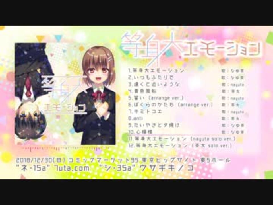 <font color="#14171a">大人になっても好きのままですか―<br><br>「等身大エモーション」<br>nayuta×茶太の新ユニット「なゆ茶」が贈る、<br>少年少女の青春をテーマにしたフルボーカルアルバム!(全12曲)</font><br><br><font color="#36393d">瀬名航、solfa、bassy、田口囁一、黒魔、キョータ、なつめ千秋、ぽてら豪華制作陣による書き下ろし楽曲のほか</font><br><font color="#36393d">nayutaと茶太それぞれの楽曲のカバーアレンジ、表題曲「等身大エモーション」のソロver.も収録!</font> <br><br>◆Information<font color="#14171a"><br>12/30(日) コミックマーケット95(2日目) 東5ホール<br> [ネ-15a] </font>7uta.com<br><font color="#14171a">[シ-35a] ウサギキノコ にて頒布! </font><br><br>Produce:なゆ茶<br>Vocal:<br>茶太<br><a href="http://chanekino.com/" target="_blank" rel="noopener nofollow">http://chanekino.com/</a><br><a href="https://twitter.com/chanekino" target="_blank" rel="noopener nofollow">https://twitter.com/chanekino</a><br><br>nayuta<br><a href="https://www.7uta.com/" target="_blank" rel="noopener nofollow">https://www.7uta.com/</a><br><a href="https://twitter.com/7utauta" target="_blank" rel="noopener nofollow">https://twitter.com/7utauta</a><br><br><b>◇「等身大エモーション」特設サイト<br><a href="https://nayucha.tumblr.com/" target="_blank" rel="noopener nofollow">https://nayucha.tumblr.com/</a> </b>