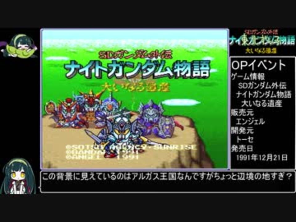 <font color="#111111">「SDガンダム外伝 ナイトガンダム物語 大いなる遺産」のバグ紹介動画です 。<br></font><br>今回は魔法や道具、装備に関するバグが多めです。<br>装備効果がない装備とダメージ計算の細かい検証については次のPARTでの紹介になります。<br><br>Q&A<br>バーニア→毒の沼地でダメージを受けないのは仕様。毒ダメージを受けないのはバグ<br>ゼノンマンサ→耐性と命中が1つずつずれて耐性値が命中に置き換わっている<br>きょうきのつるぎ→狂気が正しいですね…<br>サイコゴーレム→ありったけの魂の玉かきあつめネモ強化して殴ります。次回をお楽しみに<br>きんし→3章のゲルググは誤字かな<br>バーサルシャドウ→バグで5人で戦うことができるけど条件は精査中<br><br>PART1→<a href="https://www.nicovideo.jp/watch/sm34267466" class="watch">sm34267466</a><br>投稿リンク → <a href="https://www.nicovideo.jp/mylist/63882889" target="_blank" rel="noopener">mylist/63882889</a><br>PART1リンク → <a href="https://www.nicovideo.jp/mylist/62480170" target="_blank" rel="noopener">mylist/62480170</a> <br><font color="#111111"><br>バージョン :Ver.1.0、Ver.1.1<br>プレイ環境:スーパーファミコン(SHVC-001)、Snes9x1.55<br>コントローラ</font><font color="#111111">:</font><font color="#111111">通常、連射パッドなし<br>録画環境 :GV-USB2、アマレコTV</font><font color="#111111"><br></font>